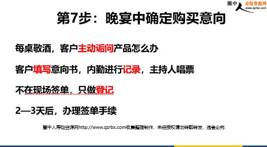 保险客户经营之高端客户家属年会经营流程 高端客户家属年会 年会概况 目的:为高端客户创造最大的价值,享受到不一 样的服务 对象:年缴保费10万以上的客户带朋友人数:30-40人,不超过4桌时间:每年12月下旬 地点:固定一个服务品质好的四星级酒店费用:每场5000元以内,品质胜于一切 每次主题不同 有新意、增加吸引力 X年:圣诞节客户答谢晚宴 X年:圣诞节频奖晚宴 X年:企业家年会 企业家家属年会 1.概况 时间:X年X月X 地点:四星级酒店数量: 邀约:提前3天打电话,参会率100% 客户:有加保空间的企业主客户,只准带爱人或一个朋友参加 参会的客户特征 年收入100万以上的企业家,有加保和转介绍潜力 喜欢接受家业人士的服务 希望扩大自己的人脉,结交高端人士,助力自己的企业发展 2.会前:提前一天发送提示短信 内容:李总您好,本周六下午4点在xx招开xx新区企业家年会,邀请您参加,同时您可以约您爱人或一位高端朋友一起参加。到场的企业家们有一个自我介绍环节,为大家创造一个创富商务圈。xx请您准时参加 效果:客户100%准时参会,排队签名登记 注意事项 个人答谢会最担心的是客户失约未到事前电话邀约,提前一天短信提醒,犹豫不定的客户当天上午再次电话提醒 2.会前:精心选择和培训服务人员 登记:助理领位:家人主持人:组训主讲人:营业部经理服务:公司内勤拍照、录像:客户