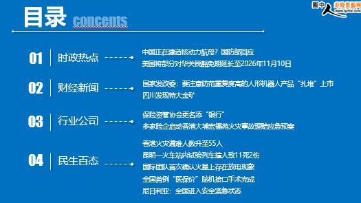 每日新闻速递 2025年11月28日 星期五 目录 时政热点 财经新闻 行业公司 民生百态 中国正在建造核动力航母?国防部回应 美国将部分对华关税豁免期延长至2026年11月10日 国家发改委:要注意防范重复度高的人形机器人产品“扎堆”上市 四川发现特大金矿 保险资管协会更名添“银行” 多家险企启动香港大埔宏福苑火灾事故理赔应急预案 香港火灾遇难人数升至55人 昆明一火车站内试验列车撞人致11死2伤 国际团队首次确认火星上存在放电现象 全国首例“医保价”脑机接口手术完成 尼日利亚:全国进入安全紧急状态 时政热点 中国正在建造核动力航母?国防部回应 2025年11月27日 16:59 来源:财联社 据澎湃新闻,国防部举行例行记者会,国防部新闻局副局长、国防部新闻发言人蒋斌大校答记者问。记者提问,福建舰服役和开展入列后首次训练引发热议。海外媒体称,中国正在建造核动力航母。请问国防部有何评论? 蒋斌表示,有关航母的建设发展情况,我们始终根据国家安全和装备技术发展需要推进航母建设。 美国将部分对华关税豁免期延长至2026年11月10日 2025年11月27日 08:59 来源:财联社 美国贸易代表办公室当地时间11月26日宣布,将把针对中国技术转让和知识产权问题、依据301条款调查所设立的关税的豁免延长至2026年11月10日。现有豁免条款原定于今年的11月29日到期。