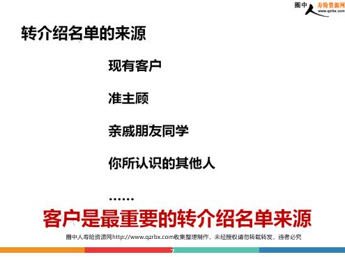 保险培训之转介绍的方法及常见的异议处理与话术 课程纲要 一、转介绍方法回顾二、常见的转介绍异议及处理 乔?吉拉德250定律:每一个客户后面都隐藏着250个客户! 随时进行转介绍,像呼吸一样自然 一、转介绍方法回顾 我们要求客户为我们做转介绍了吗? 提问 为什么还没有人给我们转介绍? 提问 专员 如何向客户索取转介绍名单呢? 现有客户准主顾亲戚朋友同学你所认识的其他人转介绍名单的来源 客户是最重要的转介绍名单来源 最近谁结婚了?谁生子了?谁搬新家了?经常和谁在一起吃饭?这样的方式可以引导客户提供名单 还有吗? 大家还记得岗前班学习的转介绍方法吗? 第一步:引导对方对保险概念给予正面回应第二步:感谢对方肯定自己所提供的服务价值第三步:要求转介绍,并记录相关资料如姓名、电话、工作信息等第四步:再次用“还有其他朋友可以介绍吗?”提示对方第五步:感谢对方帮助第六步:答应与转介绍朋友接触后及时反馈 课程纲要 一、转介绍方法回顾二、常见的转介绍异议及处理 我怕朋友会反感我上次不是已经给过你了吗我怕朋友会不喜欢/会责备我 三种常见的异议 二、常见的转介绍异议及处理 客户:我怕朋友会反感专员:您放心,我不会勉强您的朋友见我,更不会强迫他购买保险,就像我约见您一样,先征求您的同意才来见您,这样就不会使您为难;另外我和他跟进过程中的情况我会及时向您通报,这样您可以放心啦!麻烦您在这里写五个名字和联系电话,谢谢您。(递上笔记本和笔)