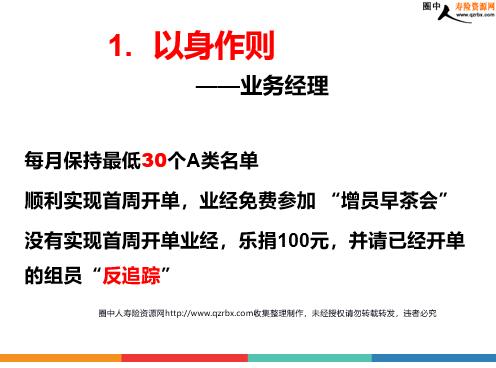 保险团队经营之敬业的重要性及其执行方法 困惑与思考 做大做强团队,一定要谈文化吗?成功企业的经验之谈 ——海尔:中正之道、敬业报国、追求卓越 ——长虹:团结、勤奋、民主、文明亲眼目睹行业内大团队一夜瓦解 没有文化的团队,就没有灵魂 团队倡导、执行最彻底—— 以敬业为荣以懈怠为耻 为什么要“敬业”? 榜样的力量——领导和内勤天道酬勤母亲的教诲师傅的传承客户(成功企业家)的心得三高追求、没有敬业何来专业 什么是“敬业”? ——把“敬业”行为化 3个工作习惯每日5访 为团队成员建立明确的行为规范 如何让每个员工 做到敬业行为? 以身作则 作息时间表: 面谈 新人承诺性面谈 “每日5访有车有房、每日6访走向辉煌” 课程介绍全员都能背诵拜访歌每日1访就地阵亡、每日2访摇摇晃晃每日3访勉勉强强、每日4访才算正常每日5访有车有房、每日6访走向辉煌 每日清晨短信“闹钟” “让我们用全身心的爱迎接今天”《羊皮卷》每月26日早晨:“至爱的校友,今天是统一整理名单的日子,请带上通讯录、客户档案等工具以及本月收入目标来公司,早会恭候您的笑脸。” “早上好,向秉承团队文化“八荣八耻”的卓越代表致敬!” 什么是“敬业”? ——把“敬业”标准化 为每个层级建立明确的目标 如何让每个员工 达成敬业标准? 以身作则 ——高级经理 个人坚持每月首日开单今年上半年个人完成47件,标保X万 X月份总公司“件数王” 以身作则 ——业务经理 每月保持最低30个A类名单顺利实现首周开单,业经免费参加“增员早茶会” 没有实现首周开单业经,乐捐100元,并请已经开单的组员“反追踪” 荣誉员工标准:万元以上 随大流员工标准:3星(5000、2+1件) 淘汰员工标准:不出勤,一件,偶尔还挂零