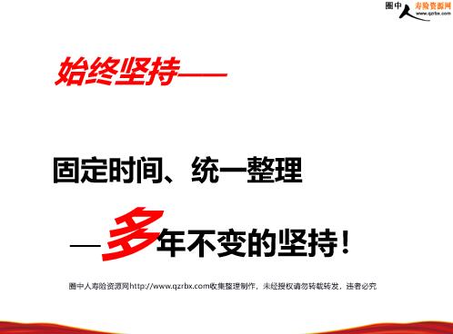 好习惯的养成来自固定统一与坚持 好习惯的养成来自—— 固定、统一、坚持 固定时间—— 月底总结与计划会重要节假日前十天公司回馈客户活动时团队重大业务竞赛时产品上市或停售时 月底总结与计划会 统一整理—— 补充完善两个档案 —整理上月工作日志,补充准客户名单,完善老客户信息确定下月服务对象 —整理档案,将生日、家庭纪念日、续收到期客户名单填入下月对应工作日志中,做服务提醒 操作流程 确定下月拜访对象 —整理档案,结合下月目标,理出30个以上准客户名单,分析准客户信息,制定下月拜访计划主管检查与辅导 —目标与准客户是否匹配 —帮助确定几个重点客户,做详细分析 帮助员工养成总结与计划的习惯第一时间明确下月目标,工作更有方向拟订了拜访计划,工作效率会更高目标与客户相连接,达成更有信心 月底统一整理档案作用—— 固定时间在26日下午要求全员出勤结合自身目标,整理准客户名单30个以上定期邀请优秀典型分享 改进方向—— 重要节假日前十天 统一整理—— 操作流程—— 请优秀典型分享端午节服务客户的重要性指导大家整理客户档案,进行客户分类 —先按有无购买xx产品来分类 —再按已缴保费多少来分类 —按不同客户确定不同的服务策略业务经理现场做电话约访及拜访演练全员通关 没有统一、精细的客户档案整理,就没有此次客户服务的成功每一次客户档案的统一整理,都会给团队伙伴创造新的销售机会 活动启示—— 客户档案,是员工取之不尽的宝藏 固定的时间还有—— 公司回馈客户活动时团队重大业务竞赛时产品上市或停售时 固定时间、统一整理 —多年不变的坚持!