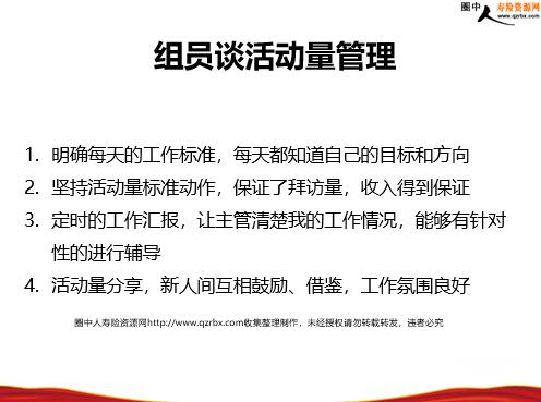 保险团队经营之 如何做好活动量管理 活动量管理 全员统一思想坚持三个固定时间 1.全员统一思想 基础(活动)管理是团队第一文化 教会各层级使用各种工具 要求主管相信、简单、坚持迅速同化新入人员 三个固定时间做三个固定的事情 2.坚持三个固定时间 ①第一个固定时间:每天二早 平台:二早“生命中的五分钟” 动作:(1)组员向主管汇报昨日拜访量(2)主管统计组员昨日拜访情况,并做简单交流(3)主管通报昨日本组成员拜访量,推荐本组分享伙伴(4)根据主管汇报评选出“昨日拜访冠军”,获部门小礼物(5)没有达到“3+2”标准,主管有权拒绝对其辅导 工具 优秀标准:333——3约访电话+3面谈+3新增名单(15分)合格标准:3+2——3面谈+2约访电话(8分) 明确每天的工作标准,每天都知道自己的目标和方向坚持活动量标准动作,保证了拜访量,收入得到保证定时的工作汇报,让主管清楚我的工作情况,能够有针对性的进行辅导活动量分享,新人间互相鼓励、借鉴,工作氛围良好 组员谈活动量管理 ②第二个固定时间:每周一 平台:周一检视会动作:组员根据“周拜访”“周总结”的记录向主管汇报有陪访需求组员填写“主顾分析表”,陪访前与主管共同还原销售流程主管填写“主管总结”表向高经汇报(主管周例会) 工具:《周计划》《周小结》《主管总结》《主顾分析表》 主管谈活动量管理 借助活动汇报高效的了解组员的工作状态,工作量通过每周工作总结,能够及时发现团队的需求和问题,以便有针对性的进行辅导。活动量管理使团队经营以可量化的方式进行,标准明确,简单易实施,成果显著 平台:每月26日启动会动作:(1)全员填写“月客户规划表”,根据A30填写月目标(2)主管统计目标,汇总给高经(3)主管填写“辅导记录”表,高经审阅