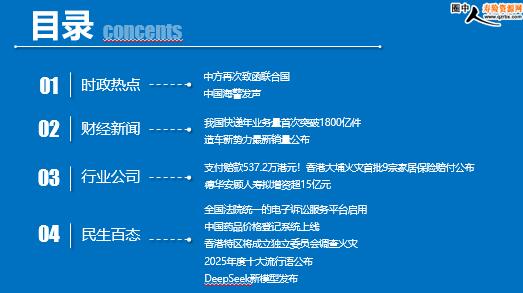每日新闻速递 2025年12月3日 星期三 目录 时政热点 财经新闻 行业公司 民生百态 中方再次致函联合国 中国海警发声 我国快递年业务量首次突破1800亿件 造车新势力最新销量公布 支付赔款537.2万港元!香港大埔火灾首批9宗家居保险赔付公布 德华安顾人寿拟增资超15亿元 全国法院统一的电子诉讼服务平台启用 中国药品价格登记系统上线 香港特区将成立独立委员会调查火灾 2025年度十大流行语公布 DeepSeek新模型发布 时政热点 中方再次致函联合国 2025年12月2日07:56 来源:澎湃新闻 12月1日,中国常驻联合国代表傅聪再次致函联合国秘书长古特雷斯,针对日本常驻联合国代表山崎和之11月24日给古特雷斯秘书长致函中有关无理狡辩言论予以严正批驳,并阐明中国政府立场。 中国海警发声 2025年12月2日 09:02 来源:环球网 中国海警局新闻发言人刘德军表示,12月2日,日“瑞宝丸”号渔船非法进入我钓鱼岛领海,中国海警舰艇依法对其采取必要管控措施并警告驱离。钓鱼岛及其附属岛屿是中国固有领土,我们敦促日方立即停止在该海域的一切侵权挑衅活动。中国海警将持续在钓鱼岛海域开展维权执法活动,坚决维护国家领土主权和海洋权益。