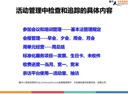 检查和追踪的必要性具体内容及其方式关键点 重点分享内容 一、检查和追踪的必要性二、检查和追踪的具体内容三、如何进行有效检查和追踪 一、检查和追踪的必要性 为什么要追踪呢? 由寿险行业的特点所决定:非现场管理 由团队经营现状所决定:技能差活动量低 内外勤及各层级主管的工作职责所在 追踪本身不是我们的目的,追踪要的是结果,是对目标执行的结果。 高频的主顾会 高成本的物质投入 非常规的负面激励 活动管理 我们的现状……对于团队、主管 分配任务时没问题 业绩不理想时没关系 阶段结束时没办法 活动量管理的现状 不愿意填写工作日志,不交活动工具回执,嫌麻烦不按要求填写工作日志及回执,只是应付一下不愿交给主管检查,不信任主管没拜访或低访问量,无日志可填 管理的核心做好团队属员的活动量管理 二、检查和追踪的内容 追踪:参与推动过程,不是寻求结果。追踪:了解动向,追寻过程。 追踪:现在做什么?怎么在做? 追踪:逼你发财,助你成功。 检查追踪 追踪是什么? 参加会议和培训管理-----基本法管理规定会报管理----早会,夕会,周会,月会周单元经营----周总结标准化服务项目—发票、生日卡、未收件收费进度—当月、宽一、宽末亲访平台使用—活动量、抽访 活动管理中检查和追踪的具体内容