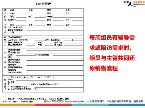 保险团队经营之 活动量管理工具表使用说明 营业组二早“5分钟”主管填写 1、组员根据“工作日志”的记录向主管汇报昨日拜访量。 2、主管统计组员昨日拜访情况,并做简单交流。 3、主管通报昨日本组成员拜访量,推荐本组分享伙伴。 4、根据主管汇报评选出“昨日拜访冠军”,获部门小礼物。 5、没有达到“3+2”(3面谈2约访)标准,主管有权拒绝对其辅导 主管每周一填写 每周组员有辅导需求或陪访需求时,组员与主管共同还原销售流程 26日全员填写 客户的基本信息、家庭情况等 续期、生日、前期拜访情况等 规划本月计划对客户完成哪些动作 从P100中圈定本月A30目标客户 月度规划表的填写过程是自己思路不断整理的过程 26日主管填写 26日主管填写 谢谢!