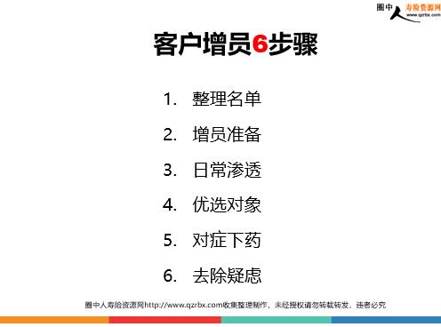 保险增员之客户增员6个步骤 客户增员,优质高效 1.节约时间,增员效率高 2.容易沟通 3.很快度过磨合期,容易管理 4.增员质量高,易留存 5.听话照做,容易辅导 6.增员资源广 客户增员6步骤 整理名单增员准备日常渗透优选对象对症下药去除疑虑 每月坚持在月初整理客户名单,梳理筛选客户信息,制定增员计划50 1.整理名单 2.增员准备 熟练掌握至少20条行业、公司的优势熟悉各类激励方案 3.日常渗透 三个话题行业的前景讲公司成长讲个人成长及荣誉 三个义务有自动续缴保费的义务有宣传保险的义务有帮助你的保险代理人成长的义务 两个问题你目前工作状况怎样? 你个人(或家庭)情况怎样? 4.优选对象 能说出保险意义与功用非常认同公司非常认同业务代表认同公司产品有亲和力,热心的客户吃苦耐劳社会中等阶层 5.对症下药 寿险人员的具体工作内容自己成长过程不断学习,获得更多培训机会快速成长,不断晋升生活品质不断提高人际关系拓展终身事业 6.去除疑虑 正确处理客户异议拒绝处理话术 客户增员的关键点 增员和销售一样,要敢于开口,有企图心把客户增员当成一种习惯 谢谢 ...........