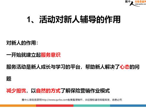 保险新人培训之活动培养新人的作用与流程 对新人的作用:一开始就建立起服务意识服务活动是新人成长与学习的平台,帮助新人解决了心态的问题减少担忧,以自然的方式了解保险营销作业模式 1、活动对新人辅导的作用 提供了有效的活动量把控平台师傅能做好表率,更好地了解属员及时解决新人出现的问题 对主任的作用: 具体做法 新人辅导采用培训班学习+参与团队活动的方式培训班:解决理论问题(寿功、专业化推销流程、产品)——班主任主导团队活动:解决实践问题(邀约、接触面谈等),活动量管控——主任主导 在团队活动中,通过对每个环节的参与和体验,学习借助活动平台签单通过反复参加活动,当新人成长为主任后,自然会将这套观念和方法再次复制给自己的新人 计划拟定:提前一个月计划并公布活动,让新人根据节奏,调整时间进行邀约宣导培训:通过大早会及新人专属会进行分享式宣导,包括邀约方式、过程分享、结果反馈,减少新人参与压力,提升参与意愿 2、活动培养新人流程介绍 活动举办:主任把新人当客户,新人学习主任各环节的动作,主任观察新人的动作是否合理活动总结:新人反馈客户的感受,主任对新人各个流程的表现进行总结,推动下次活动的参与 3、新人专属会专项支持 会议地点:营业区职场参会人员:六个月内新人会议内容:专业化销售流程、产品、团队活动专项,其中每次活动前一周的专属会专门安排团队活动的专项培训培训形式:以分享代替讲授 分享人:签约一年左右的营销员分享内容:我当时是怎么邀约客户参加活动的我的客户在活动过程中有哪些反应,我是如何解决的活动之后是如何跟进客户的参加过活动的客户在之后的3-6个月内都签单了目的:一年内新人现身说法,教会新人客户邀约及活动中的配合,树立起新人信心 新人提问时间鼓励新人对即将举办的活动提出问题分享嘉宾进行相应解答目的:解决对活动的疑问,加强信心,提升参与意愿