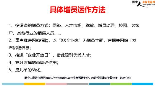 模式选择分析及 具体运作方法 大纲 模式的选择及简要分析具体的措施或提升方案 模式的选择及简要分析 (一)职场管理框架:一个区部经理+一个内勤(二)团队发展模式:“先将后兵”的发展模式以网络增员为主渠道招收“XX企业家”,结合定向招聘,以服务孤儿单为主的车险专员、以服务孤儿单为主的防癌险专员。(三)引才待遇: 1、高中:xxxx/月(3个月) 2、大专:xxxx/月(3个月)选材标准:大专以上学历,特别优秀者可适当放宽条件; 3、入围种子选手,竞聘成功,底薪3000/月(有条件底薪3个月)具体方案如下:(1)入职第一个月,有效新增x人,且主管参会率90%,团队参会率80%,底薪xxxx/月 (2)入职第二个月,累计有效新增x个,且主管参会率90%,团队参会率80%,底薪xxxx/月 (3)入职第三个月,达成组经理晋升条件,且主管参会率90%,团队参会率80%,底薪xxxx元 大纲 模式的选择及简要分析具体的措施或提升方案 具体增员运作方法 1、多渠道的增员方式:网络、人才市场、缘故、增员助理、校园、老客户、其他行业的销售人员…… 2、重点推进网络招聘,以“XX企业家”为增员主题,在相关网站上发布招聘信息; 3、推进“企业开放日”,借此吸引优秀人才; 4、充分发挥增员助理作用; 5、孤儿单的转化。 具体增员运作方法---建立增员工作模式 1、建立常态增员周经营模式,以职场面谈为主,创说会为辅的招聘形式; 2、筹建第一个月,持证人力递增30人,选拔10人作为种子选手,以其作为重点人群; 3、遵循315-3模式,每月第三周作为重点增员周,其他时间按照常态增员模式运行; 4、把增员要求渗透到收展员的日常工作中,每日一个增员访,获取一个增员资料表。 具体增员运作方法---制度经营,规划发展 1、加强基本法学习,每周进行一次的基本法测试; 2、针对种子主管进行一对一的面谈规划,分析晋升前后的利益差,调动晋升积极性; 3、阶段的基本法利益追踪(月度收入分析会、季度团队发展辅导) 具体增员运作方法---营造氛围,建立荣誉体系 1、每日对有邀约增员面谈的人员进行炒作; 2、成功送训、通过代资考、开单等进行表彰; 3、每周评选“周面谈”、“周送训”、“月增员”明星; 4、每月举办增员团康活动; ...........