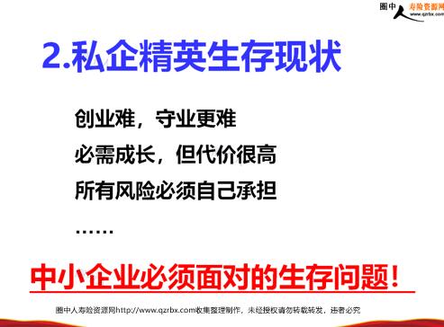 私企精英的名单搜集与接触面谈 如何成功增员这么多的私企精英? 一、搜集名单二、接触面谈 一、搜集名单: 缘故 50人的精英团队,只需直接增缘故 4人! 二、接触面谈 1.我为什么来做保险 2.私企精英生存现状 3.接触面谈 4.成功案例 1.我为什么来做保险 出于好奇,去了解免费培训,被吸引行业比较,下决心 免费培训、个人成长、心灵自由! 2.私企精英生存现状 创业难,守业更难必需成长,但代价很高所有风险必须自己承担中小企业必须面对的生存问题! 如果有一个企业能够解决上述问题,他一定会重新选择培训启示:在寿险行业,建立一个永续经营的企业! 3.接触面谈 个人经历 xx优势—— 三高理念培训体系严格规范震撼! 私企精英是最好的增员对象。只有充分了解他们的工作模式,你才敢谈、会谈! 结论 用1年时间,打造一个50人的精英团队其实并不难,只需成功增员4个人只要充分了解私企业主的工作模式,并找准需求点,他们就有可能重新选择,成为保险企业主 谢谢
