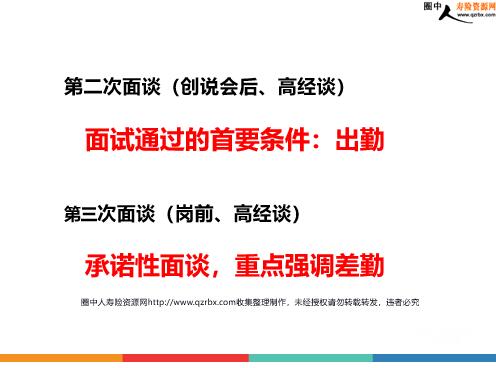 保险团队新人管理之出勤管理三要素 一定要严格出勤管理,并坚信伙伴们不会因为严格出勤而走掉! 出勤管理三要素 制度建立日常检视制度执行 制度建立:与业经达成共识 出勤制度共识以身作则共识严格执行共识 第一次面谈(创说会后、业经谈)三个必须:全职、出勤、参训 制度建立:新人的三次面谈 第二次面谈(创说会后、高经谈)面试通过的首要条件:出勤第三次面谈(岗前、高经谈)承诺性面谈,重点强调差勤 出勤报备:早会第一项组报备出勤情况执行标准:组出勤率低于部均值执行动作:业经乐捐1元、站1分钟,鞠躬1个 日常检视:部早会出勤报备 每天把管理决心传递给员工! 周五业经例会,业经汇报当周小组出勤状况 日常检视:周例会 促使业经对异常人员做进一步沟通,便于高经掌握出勤异常人员状况 是不是找到了更好的工作?你比我当时的情况强多了!你当初为什么会选择寿险?来xx不就是想挑战自己! 制度执行:月末出勤异常面谈 根据面谈结果与其主管分析留与不留的利弊,商讨挽留的可能性家访沟通,明确出勤改正期限落实原则:业经降级、业务员劝退 制度执行:严格落实 案例 基本情况:业务经理,出勤与否凭心情好坏处理方式:多次与本人沟通无效后,征得其上级主管意见,直接降级结果:大家很信服 严格+方法=有效执行 坚持严格差勤近两年的结果—— 团队伙伴对差勤制度越来越认同,并能够自觉执行好的差勤,保障了团队良好的经营氛围和经营效果团队人力、业绩每年保持100%成长 团队—— 不会因为严格管理而走掉,只会因为松懈要求而散掉! 谢谢