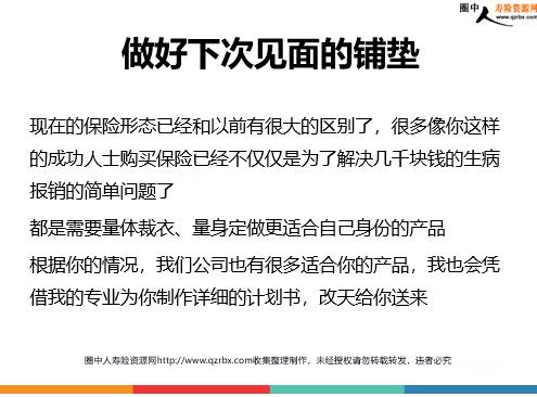 保险客户经营之大客户开拓流程 一个人如果想成功,他必须与成功的人士为伍! 1、认识大客户 主动参与忠诚高端客户聚会观察表情,锁定准客户 自信发问 想必您也是我们公司的客户吧?象你这么高端的人士怎么可能不是xx的客户呢? xx是专门为您这样的高端客户服务的。 做好下次见面的铺垫 今天很高兴能认识如此卓越的你,从你的身上我也学到了很多为人处世的方法。改天我约你,希望就保险这一话题交流一下。请你不用紧张,我不是要求你在我这里购买保险。如今保险是非常热门的话题,有很多像您这么卓越的人都购买了一些与自己身份相匹配的保险。你还没有购买是因为你不了解,所以我要为你讲解。我也知道你会拒绝我,但是,我希望你拒绝不要次数太多,否则我会失去向你学习和请教的机会,你也会失去像我这样优秀的代理人为你服务的机会。 2、约见大客户 约见地点——轻松浪漫的西餐厅着装——商务休闲装资料准备——展业包更换 技巧发问 对保险有什么看法?对保险行业有什么看法?对保险代理人有什么看法?是否购买过保险,认为保险能解决什么问题?心目中的保险应该是什么样的?反问目的:了解客户固有的保险观念了解客户心目中完美的代理人形象,成为自己的目标寻求客户保险需求点现在的保险形态已经和以前有很大的区别了,很多像你这样的成功人士购买保险已经不仅仅是为了解决几千块钱的生病报销的简单问题了都是需要量体裁衣、量身定做更适合自己身份的产品根据你的情况,我们公司也有很多适合你的产品,我也会凭借我的专业为你制作详细的计划书,改天给你送来 做好下次见面的铺垫 主动结帐 客户离开前习惯去洗手间最快速度买单 同理心,建立平等概念 3、约访大客户 电话约访(开门见山、直截了当)上次给你量身定做的计划已经完成了…… 短信约访(针对通话几次也见不上面的客户) “你好!约你这么多次想必你也有些烦了,我也觉得老打扰你不好意思!在请你原谅的同时也希望能得到你的理解,因为这是我的责任也是我的使命。为你量身设计的计划已经做好,你看是今天还是明天我给你送过来?请回复。” 只要我们能够把握好与大客户接触的每一个环节,促成是很自然的事情! 谢谢