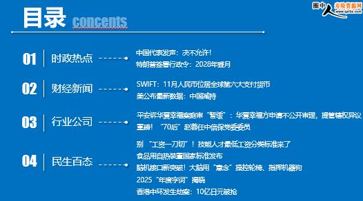 每日新闻速递 2025年12月20日 星期六 目录 时政热点 财经新闻 行业公司 民生百态 中国代表发声:决不允许! 特朗普签署行政令:2028年登月 SWIFT:11月人民币位居全球第六大支付货币 美公布最新数据:中国减持 平安诉华夏幸福案庭审“暂缓”:华夏幸福方申请不公开审理,提管辖权异议 重磅!“70后”赵蓉任中信保党委委员 别 “工资一刀切”!技能人才最低工资分类标准来了 食品用自热装置国家标准发布 脑机接口新突破!大脑用“意念”操控轮椅、指挥机器狗 2025“年度字词”揭晓 香港中环发生劫案:10亿日元被抢 时政热点 中国代表发声:决不允许! 2025年12月19日 11:37 来源:环球时报 当地时间12月18日,中国常驻联合国代表傅聪在联合国大会纪念首个“反对一切形式和表现的殖民主义国际日”高级别会议上发言时指出,日本惨无人道的殖民统治,在台湾犯下罄竹难书的罪行,决不允许否认和歪曲侵略历史,决不允许军国主义死灰复燃,决不允许历史悲剧重演。 特朗普签署行政令:2028年登月 2025年12月19日 09:18 来源:财联社 据央视新闻报道,美东时间周四(18日),特朗普签署了一项行政命令,为“美国优先”的太空政策制定了愿景,以确保美国在太空探索、安全和商业领域“引领世界”。 该行政命令旨在通过美国国家航空航天局(NASA)的阿尔忒弥斯太空计划将宇航员送回月球,并着眼于在月球上建立永久存在。