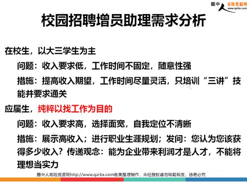 网络招聘与校园招聘的方法模式 网络招聘—— 团队裂变、快速扩散的主要渠道 团队人力,70%网络招聘主管层级,60%来自网络招聘 网络招聘要点 投资网站每位业务伙伴自己投资发招聘信息 1年内转正1个人就可以收支平衡招聘增员助理培训助理 招聘增员助理 网络招聘困惑大量时间面试、面谈,没时间做业绩解决办法:招聘增员助理 增员助理只做招聘一件事 建立绩效观念:培养危机意识,绩效考核“下岗” 成立助理团队:自己有7人的助理团队招聘标准:符合公司标准,有自主能动性、可以独立运作完成增员动作助理要求:持证上岗,强调试用期 助理面试:通过发问的方式让对方清楚与自己能力匹配的收入待遇你有几年工作经验?你有多少相关的从业经验?你合作过几家猎头公司?助理面谈有销售潜质者,引导参加培训者 “顽固”者,面谈工作标准与流程,具体要求与内勤辅专实习岗类似 培训助理 必须参加每天的早会要求主动向内勤老师学习(课件制作、资源分配、晨会运作)要去主动向外勤团队长学习(增员流程、面试流程、面谈技能、授课技能) 象培养外勤一样培训助理 骨干级助理参加主管会学习主管思维学会独立经营掌握辅导技巧跟随主管展业,掌握客户服务和销售技能 团队50%主管曾经做过助理工作 校园招聘—— 招聘在校或应届生做增员助理 在校生,以大三学生为主应届生,纯粹以找工作为目的 校园招聘增员助理需求分析 在校生,以大三学生为主问题:收入要求低,工作时间不固定,随意性强措施:提高收入期望,工作时间尽量灵活,只培训“三讲”技能并要求通关应届生,纯粹以找工作为目的问题:收入要求高,选择面宽,自我定位不清晰措施:展示高收入;进行职业生涯规划;发问:您认为您该获得多少收入?传递观念:能为企业带来利润才是人才,不能将理想当实力