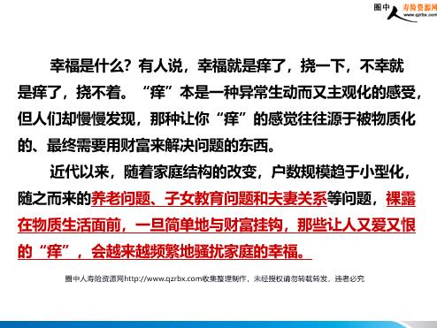 家庭生活的保险需求 幸福是什么?有人说,幸福就是痒了,挠一下,不幸就是痒了,挠不着。“痒”本是一种异常生动而又主观化的感受,但人们却慢慢发现,那种让你“痒”的感觉往往源于被物质化的、最终需要用财富来解决问题的东西。近代以来,随着家庭结构的改变,户数规模趋于小型化,随之而来的养老问题、子女教育问题和夫妻关系等问题,裸露在物质生活面前,一旦简单地与财富挂钩,那些让人又爱又恨的“痒”,会越来越频繁地骚扰家庭的幸福。 一“痒”:未来谁来养老?养老是每一个人关心的问题,也是躲脱不掉的事情。随着家庭结构的变化,养老的问题越来被专家们警示:“421”家庭,1对夫妻如何赡养4位老人?空巢老人,晚年生活靠谁?如果靠自己养老,从现在开始退休前需要准备多少钱?老年时候的依靠无非两种,一是自己,一是孩子。十年前,观念统一的是养儿防老,而现在大城市里看到更多的是倒贴子女的“啃老”父母不求子女孝敬养老钱,但求不倒贴钱给子女。在未来,一对夫妇四个老人的家庭日益普遍,还是孩子的小夫妇能否赡养得起四个老人? “一养四”看起来让人害怕,但是这笔账还是得算一下。 30年后孩子在工作,如果月收入是10万元(相当于现在的1万元),并以8%的速度增长。之后20年,孩子每月拿出20%的收入孝敬父母(每对父母获取10%),这笔钱折合成退休时的资金(按银行存款利率4.71%计算),相当于每对父母退休的时候攒了大约310万元。当然,如果孩子每月能孝敬工资的35%,尽孝30年,这笔钱就相当于每对父母退休的时候攒了830万元。这是一笔不小的数目。如果在年老的时候,既靠不上孩子,手里又没有实业和钱,就只能继续出卖自己的劳动力,这也是很多国家采取了延迟退休年龄措施的原因,但当下必须锻炼好身体。 独生子女家庭越来越多,孩子是每个父母的太阳,家庭的“贵族”。有调查显示,如果把时间作为横轴,费用作为纵轴,近年来家长们对孩子教育投资图表无疑是一根昂然向上的斜线,没有弯曲和迂回,直上云霄。一则《教育超负荷投入:家庭月收入六千孩子培训花两万》的新闻让人瞠目。深圳一月收入6000元的家庭,却为孩子报名参加2万元的海外游学班,去体验“国外小学课程”,加上路费,花去了父母两人年收入的三分之一。 二“痒”:家庭“贵族”,需要多少钱? 全国经济景气检测中心公布的居民储蓄消费意愿调查结果显示,近十年来,我国城市家庭消费支出中增长最快的是教育,其年均增长速度为20%左右。网络上盛传一份家长为孩子规划一条“贵族路”的成本:从上幼儿园,到结婚买房,需要为孩子准备573万元。