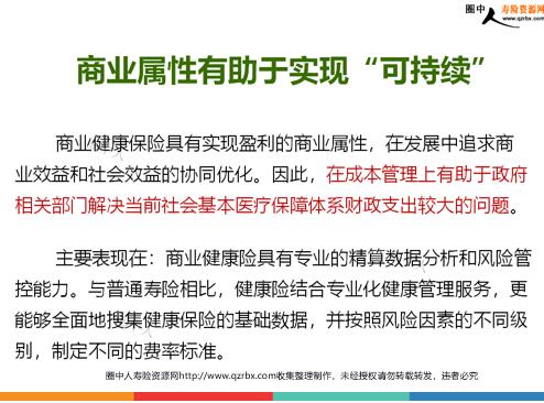 了解商业健康险 社会基本医疗保险不是实行实报实销,而是按照一定的比例报销,且报销比例只维持在基本保障的水平。因此,社会基本医疗保险的“保基本”为商业健康险遗留了更多的保障空间。比如,商业健康险可对社保中规定的个人自付比例部分与医疗费用超封顶线部分(包括门诊、住院起付标准以下个人自付部分),统筹基金支付需个人按比例自付部分,门诊、住院大额医疗需个人按比例自付部分等费用依据保险责任进行二次报销。 在“保基本”基础上提升保障水平 “广覆盖”基础上适用于流动人口商业保险的投保是以“多投多保、少投少保、不投不保的等价交换”为原则,遵循的是个人与商业保险公司之间的风险转嫁契约,规定的责任和义务不随个人时空转移、雇佣关系和户籍归属而改变。在变更合同细则方面,商业健康保险较社会基本医疗保险相关进入和退出的程序,具备了更强的便携性。 商业属性有助于实现“可持续” 商业健康保险具有实现盈利的商业属性,在发展中追求商业效益和社会效益的协同优化。因此,在成本管理上有助于政府相关部门解决当前社会基本医疗保障体系财政支出较大的问题。 主要表现在:商业健康险具有专业的精算数据分析和风险管控能力。与普通寿险相比,健康险结合专业化健康管理服务,更能够全面地搜集健康保险的基础数据,并按照风险因素的不同级别,制定不同的费率标准。 服务质量和水平具有比较优势在新医改政策背景下,民众的医疗费用可获得部分补偿,其健康保障及管理的需求更加强烈。目前,商业健康险主要的健康管理方式包括:诊前的健康指导(含健康咨询)、健康体检服务(含健康风险评估)、就诊中的家庭医生、疾病管理(含慢性疾病管理)、便利就诊服务(含诊疗绿色通道)、就诊后的康复护理服务以及第三方管理服务。通过以上健康管理手段,对于客户而言,可降低疾病的发生率,提高生命质量。 谢谢