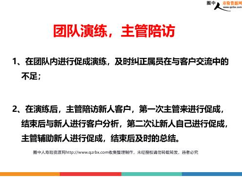 保险团队经营之 氛围营造的关键 氛围营造5关键 1、温暖团队氛围:每个月固定时间组织属员为当月的过生日的属员庆祝生日,一起郊游,烧烤等活动,在活动中让属员能够互相的交流,感受彼此温暖; 2、树立榜样:让主管在属员中树立起一面旗帜,让榜样的力量带动全体伙伴,在工作中迸发出潜能; 3、互帮互助:在工作中互相帮助是提高属员业绩和专业技能最好的方法。在实践中逐渐完善,最后运用自如; 4、拓宽视野:让每个人的视野更广阔,才更有利于团队的发展,接触世界大舞台最大的好处就是给自己一个梦,以及逐梦的动力; 5、生活上的帮助:一方面,主管可以多询问属员的生活状况,及时给予他们必要的物质帮助;另一方面,主管多关心属员的想法,让他们感到团队的温暖。最根本的,是多创造新人签单的条件,提升新人的技能,多进行演练和陪访,高效促成,解决经济问题。 深刻理解促成 促成,送达爱、责任与关怀理解保险的本质:爱、责任和关怀。解决客户的困扰,担心,协助客户在人生中规避各种风险,对销售的产品有信心,对公司有信心,大单开口。 让团队所有组员深刻认识促成的关键,并且在早会二早进行“三讲”演练,强化对公司及产品的信心。 协助客户做决定 很少有客户主动购买保险,作为代理人要协助客户做决定准客户往往不觉得现状有问题,让他接受保险建议,一般人都是拒绝改变的,要站在客户的角度为其提供建议,协助客户做出购买决定。假设同意、完美收官 与客户讲解完保险理念及利益后,假设客户同意,尝试去帮助客户完成保单的填写。 1.先由健康状况询问起,因为健康状况是很中性的信息,客户不太容易拒绝询问。 2.促成动作流畅,动作水到渠成。 四管齐下让客户说YES 尝试按照保单进行询问,从健康状况,受益人,基本资料开始,客户没有提出异议变成真的同意,有异议进行异议处理; 2.假设概念直指客户内心深处,放大他的问题、不安,并给出解决方。例:“假如您过世了,您的家人和孩子何去何从”“假如您到了60岁,已经没有赚钱的体力,养老钱从哪来?”“假如国家政策改变,您如何把自己资产安全传承给子女?”