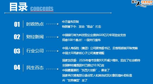 每日新闻速递 2025年12月27日 星期六 目录 时政热点 财经新闻 行业公司 民生百态 时政热点 中方宣布反制 特朗普下令:发动“致命”打击 中国银行将为科技型企业提供600亿元专项资金支持 降息100个基点!一国央行宣布 中国人寿保险(集团)公司原党委书记、总裁杨超被开除党籍 中国太平两家核心子公司高管调整 国家发改委:2026年春节放假9天并减少调休,回应了社会期待 全国耕地灌溉面积已超过10.9亿亩 中国最重要的“东西大动脉”,要来了 国家再次提高部分退役军人和其他优抚对象抚恤补助标准 AI“世界模型”来了 时政热点 2025年12月26日 17:08 来源:澎湃新闻 外交部今日发布“关于对美国军工相关企业及高级管理人员采取反制措施的决定”。美国近日宣布向中国台湾地区大规模出售武器,严重违反一个中国原则和中美三个联合公报,严重干涉中国内政,严重损害中国主权和领土完整。依据《中华人民共和国反外国制裁法》第三条、第四条、第五条、第六条、第九条、第十五条规定,中方决定对以下美国军工相关企业及高级管理人员采取反制措施。 特朗普下令:发动“致命”打击 2025年12月26日 09:13 来源:环球时报 美国总统特朗普25日傍晚在社交媒体发文说,美国当天对尼日利亚西北部的极端组织“伊斯兰国”恐怖分子发动了“强大且致命”的打击。美军非洲司令部稍后证实这一消息。 特朗普称“伊斯兰国”恐怖分子一直在“残忍地杀害无辜基督徒”,说他曾经警告要让这些恐怖分子付出惨痛代价。特朗普还说,美国“绝不会允许激进伊斯兰恐怖主义滋生蔓延”。 总部设在德国斯图加特的美军非洲司令部在一份新闻稿中说,美军当天根据特朗普和美国防部长赫格塞思的命令,与尼方协调,在尼日利亚索科托州发动空袭,打击“伊斯兰国”多座营地。初步评估显示,多名恐怖分子被打死。