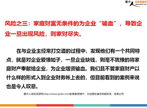 民营企业主的风险与保险需求及其经营 从近几年接触高端客户多起真实案例的经验来看,中国高端客户大部分都是民营企业主(包括股东身份),他们在全身心投入到企业的经营管理中时,往往忽略一个重要问题,那就是家庭财富与企业经营之间需要设立一道防火墙,否则,很有可能会导致企业牵连家庭,最后连最基本的家庭财富失去保障。 企业家一定要把家庭财产与企业财产相隔离 张老板拥有一幢商铺大楼,主要从事服装销售店铺出租管理生意,大约共有二百个经营小商铺租赁出去,他每月都有稳定的租金收入现金流。为了少开发票不交税,他便用女儿的名义在银行开个帐户,并通知部分不要发票的商户将租金直接支付到女儿的银行帐户中,几年累积下来,女儿的帐户共收租金过千万。 风险之一:个人帐户收取企业往来经营款,导致刑事、民事双重法律责任 但张老板没想到,后来女儿女婿闹离婚起诉到了法院,女婿向法官说妻子名下在银行还有千万存款,那是夫妻共同财产,坚决要求分割,而女儿告诉法官那是父亲公司的钱,不是自己的收入。如此一来,父亲借用女儿帐户收取企业往来经营款的行为被曝光在司法机关面前,如果法院发出司法建议书,或是女婿一气之下到税务机关举报,那么张老板将面临偷逃税的刑事责任,同时企业也面临债务偿还将由股东个人家庭承担连带责任的严重后果。 民营企业在发展过程中,往往需要寻找资金支持,向银行或小微贷款公司借款是极为常见的,许多企业家在签订抵押借款合同时,都可能会面临借款方要求,不仅企业大股东签字承担连带担保责任,还要求股东配偶到场也一并签字。这是一种比较严厉的附加条件。而且我们发现有的企业中大股东这样做了,可是小股东却拒绝承担这样的风险。 风险之二:企业融资由股东个人或家庭承担无限连带担保责任,引发家财赔光后果 如果企业在融资过程中,股东及配偶轻易在借款合同中承诺将来对企业债务承担无限连带责任,那么将来如果企业还款还不上,债权人也就是出借人是有权起诉到法院,直接冻结股东家庭中的所有财产的。如果企业家在借款时被迫要承担连带责任的话,在借款前一定要提前采取一些防护手段,以应对不利情形的发生。 在与企业主经常打交道的过程中,发现他们有一个共同特点,就是对企业爱惜如子,一旦企业缺钱,则毫不犹豫的将家庭财产奉献给企业,为企业增资输血。我们且不管家庭财产以什么样的形式入到企业财务帐上去的,但目前看到的案例来说也是令人叹息。 风险之三:家庭财富无条件的为企业“输血”,导致企业一旦出现风险,则家财尽失。