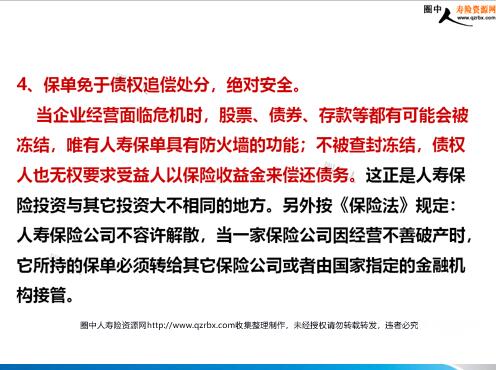 企业家拥有高额保单的 10大优越性 企业家投资理财的方式有很多种,储蓄、保险、股票、债券、期货、房地产、黄金、古董、邮票等,但是理财的优先工作是想办法保护自己和家人,以应对突然遭遇收入无着的状况。为此,你务必先为自己和家人购买适当的人寿保险和失能保险。否则,再好的理财规划都将功亏一篑。甚至可能让你和家人沦落到靠救济过日子的窘境。保险投资在家庭投资理财活动中所占比例也许并不是最大,但却是最基本的、最必需的。保险的优越性主要体现在以下几点: 1、家庭生活品质保障。当您的收入大到足以支付一切的日常开销,您的生活品质相信会比别人更舒适幸福些。可是您的收入一旦突然终止,您和您的家人的生活水准将会急速下滑,甚至可能会沦落到贫穷的境遇。如果拥有高额保险,则可以透过其“创造财富”的功用,抵御这种家庭经济风险的发生。 2、以小搏大的投资回报。普通的投资,是投入100元赚取1元的买卖,而保险却是投入1元赚取100元的投资,具有以小博大的杠杆功能。普通的投资遵循“高收益、高风险”的规律,而保险的投资却是零风险稳收益。国家对保险公司严格的监管和对保险资金运用严格的监控,把投资的风险降到很低,确保保户利益得到实现。 3、享受免税优惠的特殊财产。人寿保险金免交所得税和遗产税,在制定遗产计划时,如果没有人寿保险的参与,想要顺利的保全事业和财产几乎是不可能的。富人可透过保险规划预留足够的税源,避免资产因缴税而被迫处分,造成交易上的损失。更重要的是保险财产本身就是享有免税优惠的财产。4、保单免于债权追偿处分,绝对安全。当企业经营面临危机时,股票、债券、存款等都有可能会被冻结,唯有人寿保单具有防火墙的功能;不被查封冻结,债权人也无权要求受益人以保险收益金来偿还债务。这正是人寿保险投资与其它投资大不相同的地方。另外按《保险法》规定:人寿保险公司不容许解散,当一家保险公司因经营不善破产时,它所持的保单必须转给其它保险公司或者由国家指定的金融机构接管。 5、体现价命价值,显示经济实力。你买了多少保险,你的身价就是多少,身价越高,表明你的经济实力就越强。有位购买了高额保单的老板说:“当你同别人做生意时,告诉他你买了多少人寿保险,显示你的生命价值与经济实力,很有说服力。”