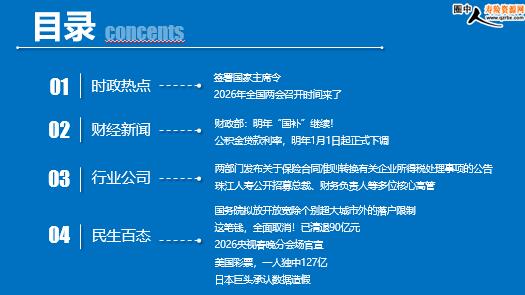 每日新闻速递 2025年12月29日 星期一 目录 时政热点 财经新闻 行业公司 民生百态 签署国家主席令 2026年全国两会召开时间来了 财政部:明年“国补”继续! 公积金贷款利率,明年1月1日起正式下调 两部门发布关于保险合同准则转换有关企业所得税处理事项的公告 珠江人寿公开招募总裁、财务负责人等多位核心高管 国务院拟放开放宽除个别超大城市外的落户限制 这笔钱,全面取消!已清退90亿元 2026央视春晚分会场官宣 美国彩票,一人独中127亿 日本巨头承认数据造假 时政热点 签署国家主席令 2025年12月27日 18:08 来源:中国经济网 十四届全国人大常委会第十九次会议27日上午在北京人民大会堂闭幕。会议经表决,通过了新修订的渔业法、危险化学品安全法、新修订的民用航空法、新修订的国家通用语言文字法、新修订的对外贸易法、关于批准全国人大常委会法制工作委员会关于法律清理工作情况和处理意见的报告的决定。国家主席习近平分别签署第63、64、65、66、67、68号主席令。 2026年全国两会召开时间来了 2025年12月27日 08:08 来源:中国经济网 全国人大常委会会议12月27日表决通过了关于召开十四届全国人大四次会议的决定。根据决定,十四届全国人大四次会议于2026年3月5日在北京召开。 政协第十四届全国委员会日前召开主席会议,建议全国政协十四届四次会议于2026年3月4日在北京召开。