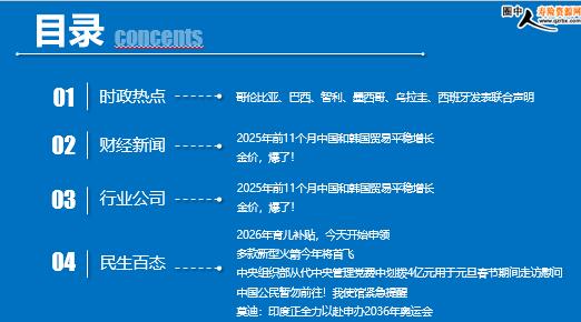 每日新闻速递 2026年1月6日 星期二 目录 时政热点 财经新闻 行业公司 民生百态 习近平会见爱尔兰总理马丁 哥伦比亚、巴西、智利、墨西哥、乌拉圭、西班牙发表联合声明 2025年前11个月中国和韩国贸易平稳增长 金价,爆了! 中国人寿法定代表人变更,利明光接任 三峡人寿获重庆发展投资公司增持 雷万春获批担任总经理 2026年育儿补贴,今天开始申领 多款新型火箭今年将首飞 中央组织部从代中央管理党费中划拨4亿元用于元旦春节期间走访慰问生活困难党员、老党员、老干部 中国公民暂勿前往!我使馆紧急提醒 莫迪:印度正全力以赴申办2036年奥运会 时政热点 哥伦比亚、巴西、智利、墨西哥、乌拉圭、西班牙发表联合声明 2026年1月5日 07:55 来源:财联社 据央视新闻,哥伦比亚、巴西、智利、墨西哥、乌拉圭和西班牙政府1月4日就委内瑞拉局势发表联合声明指出,对委实施单边军事行动为地区和平与安全开创了“极其危险的先例”,六国对此深表关切并予以反对,呼吁通过对话和谈判和平解决危机。 据哥伦比亚外交部公布的声明文件,六国认为此类军事行动违反了国际法和《联合国宪章》基本原则。委内瑞拉局势必须通过和平途径解决,由委人民主导,在不受外部干涉并遵守国际法的前提下推进。 声明强调拉丁美洲和加勒比地区作为和平区的性质,呼吁地区国家超越政治分歧实现团结,共同应对任何危害地区稳定的行动,并敦促联合国秘书长及相关多边机制发挥斡旋作用,为缓和紧张局势、维护地区和平作出贡献。 财经新闻 2025年前11个月中国和韩国贸易平稳增长 2026-01-04 14:52 来源:海关总署 据央视新闻报道,中韩是重要近邻和经贸合作伙伴。据海关统计,2025年前11个月,中国与韩国进出口2.14万亿元,同比增长1.6%,其中,中国自韩国进口1.2万亿元,对韩国出口0.94万亿元。中韩贸易占中国外贸的5.2%,双边经贸合作不断走深走实。