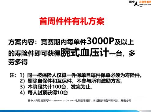 保险活动之血压计营销方案 心脑血管疾病是一种严重威胁人类,特别是50岁以上中老年人健康的常见病,即使应用目前最先进、完善的治疗手段,仍可有50%以上的脑血管意外幸存者生活不能完全自理!全世界每年死于心脑血管疾病的人数高达1700万人,居各种死因首位。 心脑血管疾病发病首因就是高血压,长期高血压可使脑动脉血管壁增厚或变硬,管腔变细。当血压骤升时,脑血管容易破裂发生脑出血;或已硬化的脑部小动脉形成一种栗粒大小的微动脉瘤,当血液波动时微动脉流破裂而造成脑出血;或高血压加快动脉硬化过程,动脉内皮细胞液受到损伤,血小板易在伤处聚集,又容易形成脑血压栓,引发心脑血管疾病。 血管增生 虽然当前医疗技术已经很先进,但仍有50%心脑血管疾病患者生活不能自理高龄人群易患心脑血管疾病,预防为主 竞赛目的:为促进人人开单推动业绩大发展,竞赛对象:全体外勤伙伴竞赛时间: 首周件件有礼方案 方案内容:竞赛期内每单件3000P及以上的寿险件即可获得腕式血压计一台,多劳多得 首周件件有礼方案 注:1)同一被保险人仅算一件保单且每件保单必须为寿险件。 2)剔除自保件和互保件,不参与所有激励方案。 3)本阶段共计100台,发完为止。 4)每人封顶获得10台 自测血压的好处 第一:能了解自己血压的真实情况。“有很多人一到医院血压就高,出了医院或进行24小时监测血压却正常,我们把这种情况叫做‘白大衣’高血压。我国估计有“白大衣”高血压4000万人,隐蔽性高血压5000万人,通过家庭自测血压,有助于对高血压的“真假”进行鉴别。 第二:可以提高患者的依从性,便于坚持药物及生活方式治疗。我国现有2亿高血压患者,高血压控制率却不足一成,原因之一就是患者不清楚自己的血压情况,光凭感觉用药。相当多的农民从未测过血压,只有到医院就诊时才发现高血压,甚至发生了脑出血时才被发现长期患有高血压。 第三:自测血压还能预测高血压患者心血管事件的发生危险。除了上述人群,老年高血压、难治性高血压患者,以及孕妇、糖尿病患者,都应坚持自测血压,因为这些人可能因血压骤然升高而引起中风、心肌梗死等,如有头晕、头痛等症状,应及时自测血压。