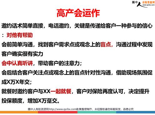 高端客户开拓及其产说会运作签单 客户情况素描 客户来源:朋友转介绍客户特征:私营企业主客户需求:资产保全持续开拓高端 富人都有自己的圈子,通过各种方式不断去尝试接触高端客户:从总裁班、商会到私人会所;同时不断要求向上转介绍积累高端客户。签单1000万趸交和100万10年交客户就是源于去年参加聚会时结识的一位私营企业主。后期虽然持续的接触,但关系不温不火,而且一直推脱保险是爱人规划,同时爱人有个很好的同学在保险公司。通过参加孩子满月酒结识了他爱人,加了微信,不断的铺垫、经营。借助高产顺利签单 在与客户不断接触中了解到客户有一定实力,但不是很确定,同时了解到客户对保险尤其是分红险不是很认可。共邀约两次高产会,第一次邀约XX高产会,最后爽约;第二次邀约到XX教授高产会,现场决定规划X万/X年,后期追踪确定先投X万趸交和X万/X年;后期再规划孩子的。 高产会运作 邀约话术简单直接,电话邀约,关键是传递给客户一种参与的信心:对他有帮助会前简单沟通,找到客户需求点或观念上的盲点,沟通过程中发现客户确实很有实力会中认真听讲,带动客户的注意力;会后结合客户关注点或观念上的盲点针对性沟通,借助现场氛围促成X万X年交;就餐时邀约客户与XX一起就餐,客户对保险再度认可,决定提升投保额度,增加X万趸交。后期回收 客户平时非常忙,很难邀约,前两次确认时间没有见面(肩负着众多人的期待,内心很焦躁)。最后强势邀约,取得见面机会。见面后由于客户观念已经打通,沟通很顺利,简单的几个常见异议处理后确定最后额度。