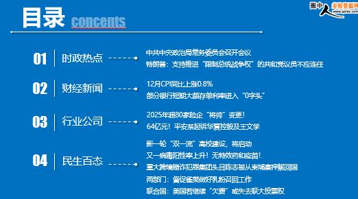 每日新闻速递 2026年1月10日 星期六 目录 时政热点 财经新闻 行业公司 民生百态 中共中央政治局常务委员会召开会议 特朗普:支持推进“限制总统战争权”的共和党议员不应连任 12月CPI同比上涨0.8% 部分银行短期大额存单利率进入“0字头” 2025年超80家险企“将帅”变更! 64亿元!平安系起诉华夏控股及王文学 新一轮“双一流”高校建设,将启动 又一病毒阳性率上升!无特效药和疫苗! 重大跨境赌诈犯罪集团头目陈志被从柬埔寨押解回国 两部门:督促雀巢做好乳粉召回工作 联合国:美国若继续“欠费”或失去联大投票权 时政热点 中共中央政治局常务委员会召开会议 2026年1月8日 19:04 来源:财联社 据央视新闻,中共中央政治局常务委员会1月8日全天召开会议,听取全国人大常委会、国务院、全国政协、最高人民法院、最高人民检察院党组工作汇报,听取中央书记处工作报告。中共中央总书记习近平主持会议并发表重要讲话。 会议指出,党中央听取全国人大常委会、国务院、全国政协、最高人民法院、最高人民检察院党组工作汇报和中央书记处工作报告,是坚持和完善党的领导制度体系,把党中央集中统一领导落实到国家治理各领域各方面各环节的重要举措。“十五五”时期,我国发展环境面临深刻复杂变化,工作任务艰巨繁重,要坚持好、运用好、发展好党的领导这一最大优势,为中国式现代化建设提供根本保证。 特朗普:支持推进“限制总统战争权”的共和党议员不应连任 2026年1月9日 02:04 来源:财联社 据央视新闻,当地时间1月8日,美国总统特朗普在其社交媒体“真实社交”发文表示,那些支持在参议院推进“限制总统战争权”的共和党议员不应获得连任。 特朗普称,苏珊·柯林斯、丽莎·穆尔科斯基、兰德·保罗、乔什·霍利和托德·杨不应该再被选入公职。他宣称,这次投票严重损害了美国的自卫能力和国家安全,削弱了总统作为三军统帅的权力。参议院当天以52票赞成、47票反对的结果通过程序性投票,从而得以推动“禁止总统在未经国会授权情况下对委内瑞拉采取进一步军事行动”的决议,为该决议在参议院进一步审议铺平道路。 当前参议院由共和党53席、民主党45席和独立议员2席组成。此前,类似决议曾两次在参议院被共和党人阻挠,未能通过。当时,特朗普政府正逐步加大对委内瑞拉的军事施压。这一决议仍需在参众两院获得通过,并有可能被特朗普否决。