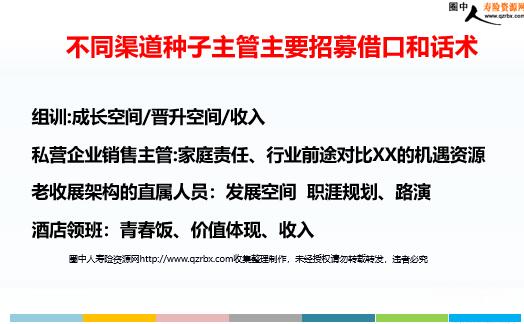 架构选择及种子主管的培养追踪和推动 如何做好架构选择和种子准管培养 如何做好种子主管晋升的日常追踪和推动 “种子”主管选拔 1、种子主管具备的特点:时间性培育性成长性 2、特点决定重要性、严肃性按照找----筛----定三部原则 种子主管选拔------找 选拔条件:年龄:25-35岁学历:大专以上遵循的定律 三有定律有人脉资源有专业背景有营销经验 三限定律限营销转入限二次入司限周期过长 种子主管选拔------找(当地情况) 渠道来源: 1、内部竞聘,公司内部组训讲师,工作年限在3年以上; 2、老收展架构的直属人员 3、餐饮娱乐行业管理人员,酒店大堂经理 4、私营企业销售主管(玻璃厂) 种子主管选拔------筛 1、初步面谈填写性向测试参观职场文化(突出讲解晋升文化和晋升的人员) 2、面试选拔邀请公司领导参与将才面试,提高重视程度,根据性向测试及沟通,“交谈—交易—交心” 种子主管选拔-----定 3、规划晋升根据选拔情况设定晋升的时间,和年度的晋升规划 4、分拨激励:对未选上的人员,进行鼓励,同时规划下步工作及晋升规划 5、培训结业参加种子主管培训班并顺利结业 不同渠道种子主管主要招募借口和话术