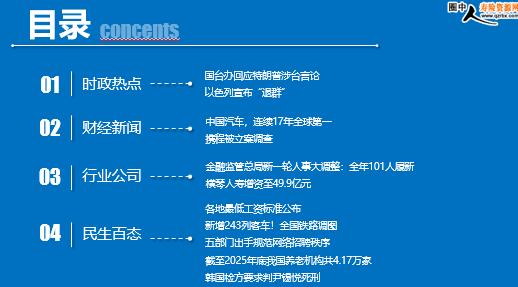 每日新闻速递 2026年1月15日 星期四 目录 时政热点 财经新闻 行业公司 民生百态 国台办回应特朗普涉台言论 以色列宣布“退群” 中国汽车,连续17年全球第一 携程被立案调查 金融监管总局新一轮人事大调整:全年101人履新 横琴人寿增资至49.9亿元 各地最低工资标准公布 新增243列客车!全国铁路调图 五部门出手规范网络招聘秩序 截至2025年底我国养老机构共4.17万家 韩国检方要求判尹锡悦死刑 时政热点 国台办回应特朗普涉台言论 2026年1月14日 12:35 来源:财联社 据央视新闻消息,1月14日,国务院台办举行例行新闻发布会。有记者提问称,美国总统特朗普日前接受《纽约时报》访问时称,中方认为台湾是中国领土的一部分,如何处理台湾问题由中方决定,引发岛内关注。 对此,发言人朱凤莲表示,世界上只有一个中国,台湾是中国的一部分,台湾问题是中国内政,解决台湾问题是中国人自己的事,我们将坚定维护国家主权、安全和领土完整。 以色列宣布“退群” 2026年1月14日 08:35 来源:财联社 据央视新闻报道,以色列外交部长萨尔宣布,以色列决定退出多个联合国机构及相关组织。 以方称,这些机构存在“反以色列偏见”等问题。以色列退出的机构包括联合国秘书长儿童与武装冲突问题特别代表办公室、联合国妇女署、联合国贸易和发展会议、联合国西亚经济社会委员会、联合国文明联盟、联合国能源机制以及全球移民与发展论坛。 以色列外交部称,将继续审查与其他联合国机构的合作关系,并在未来作出进一步决定。