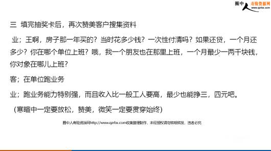 利用抽奖卡进行主顾开拓的逻辑与话术 先进行电话约访,(同学。朋友很久没有见面的)业:XX吗?现在接听电话方便吗?客:方便,你是哪位?业:我是XX啊,很长时间没见面了,最近忙吗?客:还可以,有事吗?业:是这样的,我们公司举行X周年庆典,在全国举行大规模的抽奖活动,我给同学特意准备了些抽奖卷,填一下碰碰手气,你现在在家吗?客,我不在家业:那你大约什么时候回来?客:今天在朋友家吃饭,会很晚业:那就明天吧,正好明天傍晚我要到XX附近办事,你是几号楼几单元几楼?好吧,明天见。送抽奖劵的流程进门简单的寒暄:第一种情况,熟悉的朋友,先简单的赞美,从房间的摆设,面积,装修,最近的工作情况,简单的聊一下,随即进入抽奖卡的填写。第二种情况,通过抽奖卡转介绍的客户,约好时间见面,敲门,开门,先简单的寒暄。寒暄赞美的时间不宜太长,保持在10到15分钟之内)业:微笑,你好,王,找双拖鞋换一下,家收拾的真干净,装的也特别好,你家多少平方?客:八十多平方业;不像八十多平方,这种装修显得家特别宽敞,真不错。王,XX在我面前经常提到你,说你们关系处的特别好,人也特别实在,今天一见面,真的感觉特别好。王啊,也不耽误你太多时间,我今天来主要是有个好事告诉你,我们公司今年成立已经X周年,公司为了回馈新老客户,举办了大规模的抽奖活动,我特意给朋友准备了一些抽奖卷。今天过来主要是给你填一张,碰碰手气,说不定还能中奖呢。客;哦,是吗,我可没那么好的运气,以前从来没中过奖。再说,你们这抽奖活动都有什么奖品啊业;那可说不定啊,以前没中不代表现在就中不了。因为公司这次的抽奖活动中奖率很高,每个星期都会进行一次抽取。在前几次的抽奖活动中很多客户已经中得。奖品也很多,有白玉碗,有套壶,有折叠水桶等,当然,公司每次抽奖活动为客户准备的奖品也会不一样,但都是客户非常喜欢的。这时随手拿出抽奖卷和笔,指点着让客户填写。你看,这就是我们公司寻找XX福运抽奖卡二填抽奖卷(这时把抽奖卷随手拿出来,推到客户面前,把笔递给客户。指着让客户填写) 1来,在这写上你的名字,电话,把具体的地址写一下。 2为了更好的服务客户,在这简单的打几个勾。