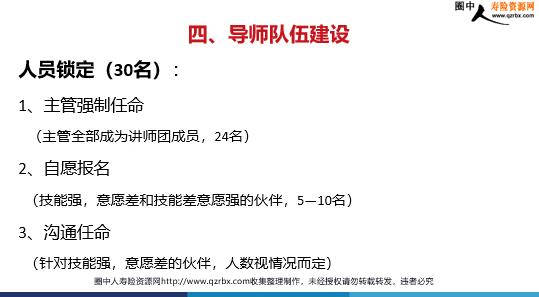 保险新人育成的模式及其实施与导师队伍建设 研讨问题: 1、选择模式和理由(列举一个案例,详细描述理由) 2、具体实施设想(育成工作落实) 3、核心工具的使用(各层级人员衔接督导机制) 4、导师队伍建设(人群锁定,选拔条件,考核激励政策)一、选择模式和理由 模式科学合理,新人随时入营。课程紧密衔接,提高新人育成。主管自主经营,技能传承高效。讲师队伍建设,释放管理压力。理论实践结合,贴近市场需求。坚持常态运作,建立良好习惯。新人批量育成,复制成功经验。培训循环召开,提升考核指标。为啥做——(Why)怎么做——(How)谁来做——(Who) 二、具体实施设想 为啥做(Why)——经营目标 1、养成三个习惯(参会习惯、拜访习惯、收集名单习惯) 2、达成三个目标(销售目标每月至少2件长险或6件短险、增员目标每季度至少1人、服务目标孤单服务品质) 3、改善七项考核指标(出勤率、举绩率、转正率、留存率、面见率、达优率、增员率) 新人育成关键点 公司 主管 新人 领导重视财务支持 项目成立人员分工 项目启动层级培训 锁定人群分班运作 行事历主管面谈 自主经营 专家门诊 坚持参训 市场实践 养成习惯 讲师培养