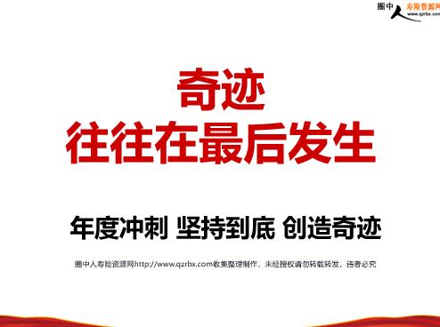 保险激励之冲刺拼搏到最后一秒 指在比赛或者运动过程中全力拼搏的一种表现形式。赛跑临近终点时“突然加速”向前猛冲。 冲刺 北京时间09年8月17日凌晨,牙买加飞人博尔特在柏林田径世锦赛上以9秒58的惊人成绩再次打破男子百米世界纪录。 在最后30米的冲刺过程中,速度高达11米/秒! 为了达成自己的目标,越到终点,速度越快。以挑战自我,突破自我的极限,进行最后的冲刺! 在冲刺的过程中,忘记了恐惧,忘记了一切,全力以赴就为一个目标全力冲刺,直到达成!实现潜能的无限迸发! 在这一刻,所有情感淋漓尽致的展现那是因为人类最美的语言在向我们传递信息 之所以动人是因为最纯洁最干净的心灵在表达之所以感人是因为在困难面前他们都选择了坚强面对之所以惊人是因为无数个日日夜夜的训练才能创造纪录 在这一刻,所有情感淋漓尽致的展现那是因为冲刺的过程中让我们的目标无比坚定 之所以动人是因为在冲刺的过程中最坚定最执着的心在表达之所以感人是因为在冲刺的过程中面对困难他们都选择了坚强面对之所以惊人是因为在最后时刻舍命冲刺才能创造纪录 年龄、身体、性别、能力…… 一定不是我们的障碍重要的是我们有一颗永不停止前进的心 当我们用汗水与拼搏浇铸的人生金牌紧握在手时,那一刻就是人生最美丽动人的时刻。一切的付出都将写进历史,铭刻在心。 而这一切美好获得的开始, 我们需要的只是 一场属于我们自己的“冲刺” 奇迹 往往在最后发生 年度冲刺坚持到底创造奇迹 如果你现在发烧40°你会干什么? 1998年6月14日,乔丹率领公牛队客场挑战犹他爵士队。在此之前,公牛队3比2领先爵士,公牛队距离第二个“三连冠”伟业只有一步之遥。比赛当晚,乔丹发烧接近40摄氏度,当天他脱水严重,在上场之前一直在输液。但顽强的他执意要在比赛中先发出场。在关键的第四节,还有35.7秒比赛就将结束,但公牛队还落后一分,而更让人担心的是球权在爵士队手里,只要爵士队把时间耗光,在最后时刻出手,那么公牛队就只能败走盐湖城。