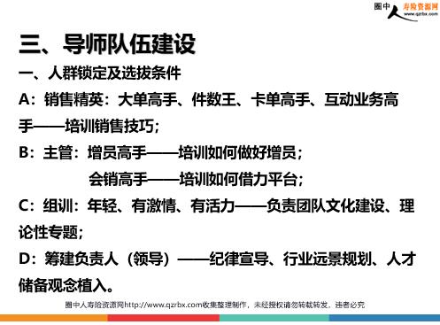 保险新人育成模式的具体设施工具使用及导师队伍建设 具体实施设想 核心工具使用 导师队伍建设 具体实施设想 核心工具使用 目录 1、培训课程分配及讲解人确定; 2、安排行事历,按行事历严格落实; 3、导师根据授课内容及受众的不同,理论结合自身实战经验传授; 4、主管严格规范团队的日常管理; 5、定期效果评估(一周或半月)边走边看边总结边改进; 6、新人育成与日常管理合并,单独职场经营。 一、具体实施设想 二、核心工具的使用(各层级人员衔接,督导机制) 三册:培训手册——新人(准收展员)培训手册——收展员至资深客户经理(业务系列适用)主管辅导手册——主管及筹备主管; “三册一表” 1、授课导师:授课满意度; 一表:督导评估表 2、考评新人参训率、转正率; 一表:督导评估表 3、考评业务系列人员参训率、举绩率、面见率、达优率、增员覆盖率; 一表:督导评估表 4、考评主管系列:参训率、个人增员率及团队增员率、团队举绩率,三晋率、团队达成合格人力、团队FYC提升率。 一表:督导评估表 三、导师队伍建设 一、人群锁定及选拔条件 A:销售精英:大单高手、件数王、卡单高手、互动业务高手——培训销售技巧; B:主管:增员高手——培训如何做好增员;会销高手——培训如何借力平台; C:组训:年轻、有激情、有活力——负责团队文化建设、理论性专题; D:筹建负责人(领导)——纪律宣导、行业远景规划、人才储备观念植入。 二、考核激励政策 A:课时费 B:荣誉激励(最佳导师评选、满意度测评) C:长期激励政策(方案)以每个季度为考核节点、以新人的结训率(30%)转正率(25)、出勤率(30%)、举绩率(15%)为考核指标,考评待改进、合格、良好、优秀,据考评结果奖励导师团(实物、旅游、外出培训等)。