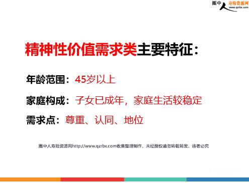 现有员工需求分类及面谈 抓住现有员工需求进行有效面谈 绩优人员的成长源于—— 根据马斯洛需求原理团队现有员工可以大致分为两类 精神性价值需求物质性价值需求 物质性价值需求类主要特征: 年龄范围:30-45岁之间家庭构成:已婚,上有老下有小需求点:衣食住行(买房、买车)、子女教育、老人赡养 精神性价值需求类主要特征: 年龄范围:45岁以上家庭构成:子女已成年,家庭生活较稳定需求点:尊重、认同、地位 需求面谈对于一个员工来讲仅是个人业绩的提升,而对于一个团队长来讲则是团队整体的突破。 ”面谈“关键点 1、理性分析 2、感性憧憬 3、适时面谈 只有激发和成就了员工的需求,才能成就我们的需求——实现绩优人员的突破性成长。 谢谢