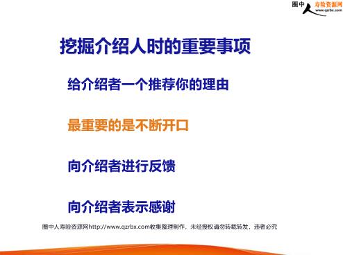保险准客户开发的步骤及其转介绍流程话术 开拓准客户电话约访 初次面谈 促成 需求分析 新件受理 转介绍 保单递送 销售流程回顾 所谓准客户? ?有接近可能性的人 ?有人寿保险需求的人 ?有缴保费能力的人 ?符合公司的投保条件的人营销中最令人望而却步的是 “不知要去找谁”的恐惧心理寿险最大的困难是开发准客户(LIMRA调查) 我的准客户在哪里? 准客户开发四步骤 制定计划 收集信息 持续地、一贯地开发 仔细观察客户身边的人群 制定计划 根据自己的收入目标,制定每月开发准客户计划并分解为每周、每日计划,每天按时完成当日计划。抱有“某一时段集中开发准客户或暂时中断,应该问题不大的”想法,疏忽准客户开发将无法保证自己的收入。 收集信息是营销的基础,要学会分辨哪些信息是关键性信息。家庭人口、职业、月收入、年龄、已投的保险等等,收集与客户有关的信息。多了解一些客户的信息,多一分成功的保证。 收集信息 在企业的生产流程中,中间环节很重要,但是最基本的、最关键的是原材料。若原材料供应中断,整个生产线就要瘫痪。开发准客户就是保险销售的原材料。因此,我们每天要在开发准客户上投入精力,并持之以恒。持续地、一贯地开发 关注客户身边发生的事(晋升、生子、结婚等),从而跟客户交谈时,很自然地引导话题,继而能找到销售保险的机会 仔细观察客户身边的人群 X市场——缘故市场 Y市场——转介绍 Z市场——陌生市场 开发准客户的方法