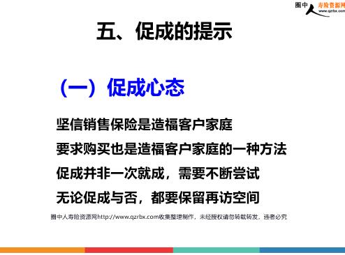 保险销售培训之促成的意义要素时机与方法 课程大纲 一、促成的意义二、促成的要素三、促成的时机四、促成的方法五、促成的提示 95%以上的人购买保险是因为服务人员的说明、引导,所以促成技巧是专业服务人员必须用心研究并熟练运用的行销技巧。 观念性的商品 无形的商品 保险商品的特性 促成是行销中产生绩效的关键环节促成不是一次性的动作攻下一个客户就是突破一个市场 一、促成的意义 跟进(促成动作、决定)你引导他买保险的动作到位吗? 注:检视促成结果的三个方向 相信(接触过程)你是他要买保险的首选服务人员吗? 共鸣(说明、拒绝处理)你的讲解能不能打动他的心? 认同保险认同公司认同专员 逻辑强有重点易理解 洞悉良机把握节奏果断促成 二、促成的要素 在说服客户的过程中,当客户考虑是否购买、面临抉择时会出现行为、语言的变化,这些就是促成的迹象,也是促成良机。 三、促成的时机 当客户: 沉默时查看费率表时查看资料时客户招待你吃东西时客户边听边点头,表示赞同时客户讨价还价时客户询问相关手续时