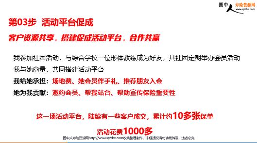 保险客户经营之活动经营四步成交 活动经营四步成交 如何破圈? 1、持续拓客,获得准主顾名单很重要 2、大部分客户不愿意到职场来参加产说会,走出去很重要 3、客户对于陌生人的第一印象是排斥,不信任,特别针对从事销售工作的人群 4、合适的方式,接触合适的人群很重要,后期培养成为自己的客户 快节奏的生活方式,如何精确锁定准客户人群合适的方式接触,破圈经营,培养成为自己的客户 方法 活动经营四步成交 活动接触破圈 第01步 第02步 第03步 第04步 锁定核心对象 活动平台促成 持续客养及转介绍 第01步活动接触破圈 参加外部各类高品质人群愿意参与的活动,如外部交流学习及考证、商会、形体等…… 谦卑的心态融入活动当中,收集名单,建立链接和信任关系。 第02步锁定核心对象 有号召力有组织力有影响力 信任你支持你帮助你 会长教练老师班长把核心对象培养成为自己的知心好友 第03步活动平台促成 我参加社团活动,与综合学校一位形体教练成为好友,其社团定期举办会员活动我与她商量,共同搭建活动平台我给她承担:场地费、她会员伴手礼、推荐朋友入会她为我贡献:邀约会员、帮我站台、帮助宣传保险重要性 这一场活动平台,陆续有一些客户成交,累计约10多张保单活动花费1000多
