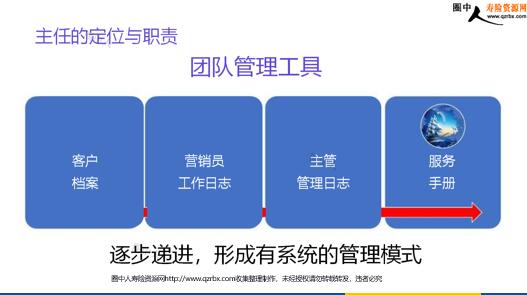 主任的定位与职责四件事 主任的定位与职责 当我们面对主管,对主管每天的工作与做营销员时有什么不同? 营销员与主管的异同点 制定计划主顾开拓销售保单售后服务 相同点 有效增员训练辅导会议经营追踪激励团队建设 不同点 从经营客户到经营团队,从自我管理到员工管理。 主管的角色定位 单一角色 多重角色 主任的定位 团队管理者做XX老板 主管的角色与定位 我们只需要关注团队的经营 与普通老板 对比 我与 XX 的关系 产品 公司在销的个险产品 门面 XX人寿XX中支XX支公司/营销服务部 品牌 XX人寿保险股份有限公司 员工 你的属员 培训 公司各类会议 销售 支持 公司各项营销企划 售后 服务 公司客服 我与 组员 的关系 批发 零售 做主管让我们利益更大 规划师 训练师 激励师 评估师 我们应该是 团队的 你心目中的好主管是什么样子? 主管的常见角色错误 甩手掌柜型对组员不管不问,都交给公司内勤 大包大揽型什么事情都替属员做了 官僚主义型以为自己是多大的官 一毛不拔型很少花钱在团队经营上