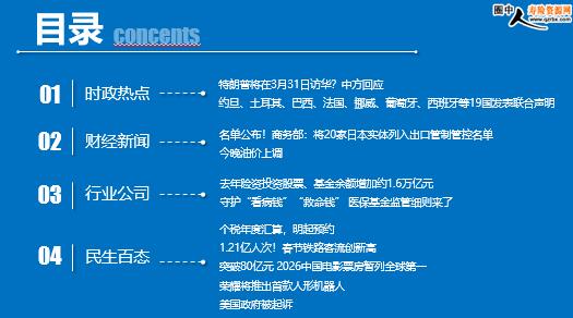 每日新闻速递 2026年2月25日 星期三 目录 时政热点 财经新闻 行业公司 民生百态 特朗普将在3月31日访华?中方回应 卡塔尔、沙特、埃及、约旦、土耳其、巴西、法国、挪威、葡萄牙、西班牙等19国发表联合声明 名单公布!商务部:将20家日本实体列入出口管制管控名单 今晚油价上调 去年险资投资股票、基金余额增加约1.6万亿元 守护“看病钱”“救命钱” 医保基金监管细则来了 个税年度汇算,明起预约 1.21亿人次!春节铁路客流创新高 突破80亿元 2026中国电影票房暂列全球第一 荣耀将推出首款人形机器人 美国政府被起诉 时政热点 特朗普将在3月31日访华?中方回应 2026年2月24日 15:36 来源:财联社 据北京日报,2月24日,外交部发言人毛宁主持例行记者会。 有记者提问,有报道称,美国总统特朗普将会在3月31日访问中国。外交部能否予以证实? 毛宁表示,元首外交对中美关系发挥着不可替代的战略引领作用。中美双方就特朗普总统访华事宜保持着沟通。但是,关于你提到的具体问题,我目前没有可以提供的信息。 卡塔尔、沙特、埃及、约旦、土耳其、巴西、法国、挪威、葡萄牙、西班牙等19国发表联合声明 2026年2月24日 07:13 来源:环球网 当地时间2月23日,卡塔尔外交部表示,卡塔尔、沙特、埃及、约旦、土耳其、巴勒斯坦、巴西、法国、丹麦、芬兰、冰岛、印尼、爱尔兰、卢森堡、挪威、葡萄牙、斯洛文尼亚、西班牙、瑞典19个国家的外交部长,以及阿拉伯国家联盟和伊斯兰合作组织的秘书长发表联合声明,强烈谴责以色列安全内阁批准一系列决定,大幅改变在约旦河西岸的政策,加强对约旦河西岸的控制,并加速扩大犹太人定居点。 声明表示,以色列相关举措公然违反国际法,意在改变当地现实,推进对巴勒斯坦被占领土的侵占,破坏了该地区正在进行的和平与稳定努力,并对地区一体化前景构成威胁。各方呼吁以色列政府立即撤回上述措施,切实履行国际义务,避免采取任何可能导致巴勒斯坦被占领土法律和行政地位永久性改变的行动。