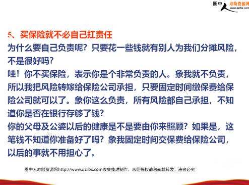 保单计划闪电说明术 1、未来事不可知,我们唯一可掌握的是现在孕妇最大的担心是什么?(胎儿的健康)但她唯一能做的是什么?(好好照顾胎儿),所以未来事不可知,我们唯一可掌握的是现在,现在可以做好的准备,现在就先将它准备起来。高考考生最大的担心是什么?(落榜)但他唯一能做的是什么?(好好准备考试)所以未来事不可知,我们唯一可掌握的是现在,现在可以做好的准备,现在就先将它准备起来。 2、事业是你的保障,那谁是你孩子的保障?事业是你的保障,所以你不敢掉以轻心,那谁是你孩子的保障?(父母)谁来保护他们?(保险公司)健康是你的保障,有健康的身体才有未来的事业,那谁是你孩子的保障?开进口车是你行车安全的保障,那谁是你孩子的保障? 3、您知道您为什么要买保险?您知道为什么要买保险?保险是防患于未然,在我们有能力时让保险公司分摊我们的风险,让我们在身体不适时安心养病,同时也不会造成家庭的经济负担。 4、我一个朋友问我,保险是什么?我说:保险是一种保障,也是一种投资,如果有一份完善的保险,个人及家庭就无后顾之忧。我说:保险就是金字塔的正中一块根基,如果根基不稳,其他房子存款、股票等等随时会倒塌。我说:保险就是1/1000与100/100的不同。若公司的员工有1000名,其中死亡1人,对公司而言只是1/1000的损失,但对个人的家庭而言,就是100/100的损失,保险对你及你家人而言是非常重要的。 5、买保险就不必自己扛责任为什么要自己负责呢?只要花一些钱就有别人为我们分摊风险,不是很好吗?哇!你不买保险,表示你是个非常负责的人。象我就不负责,所以我把风险转嫁给保险公司承担,只要固定时间缴保费给保险公司就可以了。象你这么负责,所有风险都自己承担,不知道你是否在银行存够了钱?你的父母及公婆以后的健康是不是要由你来照顾?如果是,这笔钱不知道你准备好了吗?象我固定时间交保费给保险公司,以后的事就不用担心了。 6、家庭保障中国人都非常照顾后代。如果缴很少的费用,能够得到最高的保障,不知道你觉得怎样?人生是无常的,你如何保证你的子女完成教育。只有通过保险,在你最健康,收入最好的时候来准备,陈先生,我这里有一份计划,供您参考。子女是我们的最爱。是这样的,能在我们有能力时拿出一点钱来购买一份完整的保单,万一我们有不幸时可留下一笔钱,给我们子女完成学业,我们很放心,为自己的事业去努力。我回公司为您量身定做一份建议书供你参考。保险可以让我们的家庭免除后顾之忧,而且它是一种责任与爱的表现,可以作为我们的人生规划。