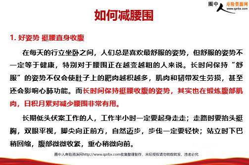 保险健康之 腰围上的中国 肥胖,曾被中国人视为“富态”,如今却被公认为“病态”。改革开放以来,中国仅用了二三十年的时间,就实现了从食物短缺到供给充足的历史性跨越。然而,中国人在富起来的同时,也迅速胖起来了,超重和肥胖人口数量直线上升。肥胖不仅是心脑血管等疾病的重要诱因,也是影响人均寿命的关键因素。医学研究证明,腰围和寿命成反比,腰围越长,寿命越短。如果说“舌尖上的中国”展现的是中华饮食文化的博大精深,那么,“腰围上的负担”则暴露了中华民族的健康危机。一位西方作家指出,肥胖问题将成为中国未来经济发展和公共卫生系统的一枚“定时炸弹”。作为一个“未富先胖”的国家,中国很难承受日益增加的医疗费用支出之重。肥胖,无疑成为中国经济增长的“负能量”。 很多人以为,和西方人相比,中国的胖人并不算多。但上海交通大学发表的研究显示,目前中国人肥胖增长的速度已经全球第二,仅次于墨西哥。卫生部颁布的《中国成人超重和肥胖症预防控制指南》明确规定,男性腰围≥85厘米,女性腰围≥80厘米为腰围超标的界限。腰围增大预示肥胖,而谁都知道,肥胖是高血压、糖尿病的“先遣兵”。肥胖可导致高血压、糖尿病、心脏病、癌症、胆囊炎、关节炎等一系列疾病。世界癌症研究基金会报告称,腰围每增加1英寸,患癌症的风险就增加8倍。世界心脏病联合会预言,肥胖有可能取代吸烟成为导致心脏病和中风的最主要杀手。 腰围与健康 北京男性腰围3年长1厘米 近日,市卫计委公布了北京市常住居民的肥胖情况。按照北京市三年一次的慢性病及危险因素监测数据显示,18岁至79岁常住居民肥胖率为21.1%。也就是说每5个人就有1个肥胖患者。此外,北京成年常住居民的腰围平均值为83.7cm,男性腰围增长更为明显,增长近1厘米,达到88.7厘米,相当于2尺6寸6,而2尺7是之前“北京人健康指引”公布的上限,这意味着男性腰围面临“集体超标”的危险。除了成人,儿童青少年肥胖问题也不容忽视。近年来,北京市中小学生肥胖总检出率持续上升。为什么会肥胖? 1.“待着”时间过长科学研究认为,累计超过4小时的静态行为是慢性病的一个独立危险因素,对健康的危害会逐渐显现。此外,青少年每天看电视2小时以上就可能导致锻炼不足、自卑、社交能力过低,甚至学习成绩下降。 2.摄入油盐量超标市卫计委表示,随着居民生活水平的提高、饮食结构不合理,谷物摄入量少,高脂肪、高热量食物摄入多的现象日益突出。 3.缺少锻炼现代人过着快节奏的生活,面对生活、工作等各方面压力,能够坚持锻炼身体的人廖廖无几。 如何减腰围 1.好姿势挺腰直身收腹在每天的行立坐卧之间,人们总是喜欢最舒服的姿势,但舒服的姿势不一定等于健康,特别对于腰围正在越变越粗的人来说。长时间保持“舒服”的姿势不仅会使肚子上的肥肉越积越多,肌肉和韧带发生劳损,甚至还会影响心肺功能。而长时间保持挺腰收腹的姿势,其实也在锻炼腹部肌肉,日积月累对减少腰围非常有用。长期低头伏案工作的人,工作半小时一定要起身走走;走路时要抬头挺胸,双眼平视,脚尖向正前方,自然迈步,步伐一定要轻快;站立时下巴稍回缩,腹部微微收紧,重心稍微向前。