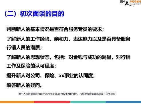 保险增员之 增募初次面谈流程及其话术 课程大纲 增募初次面谈流程增募流程回顾室经理初次面谈的目的室经理初次面谈指引 “双赢”的增募话术 “初次面谈”演练 (一)增募流程回顾 增募初次面谈流程 (二)初次面谈的目的 判断新人的基本情况是否符合服务专员的要求;了解新人的工作经验、亲和力、表达能力以及是否具备服务行销人员的潜质;了解新人的思想状态,包括:对金钱与成功的渴望,对行销工作及保险的认可程度;提升新人对公司、保险、xx事业的认同度;解答新人的疑问。 (三)初次面谈指引话术 1.标准开场白您好,我是XX经理,这是我的名片,请指教。首先欢迎您来到我们xx寿险,我们会用XX分钟左右的时间和您谈谈这个行业、公司以及保险这个事业,以及您自己的一些情况,帮助您做出正确的选择,之后我也欢迎您问我一些问题。好,那我们就依照公司统一的面试标准开始好吗? 2.初次面谈的考察点 3.初次面谈对象(针对初次面谈优秀的新人)(1)提问“现在,您有什么问题要问吗?”(根据提问适当做出回答)(2)后续面试、培训及报聘等说明 4.初次面谈“六不要” 不要不断地赞美、肯定对方不要说的多,聆听得少不要有过多的销售促成的行为模式,不要求成心切,要讲究循序渐进不要一厢情愿,没能站在对方角度不要久谈,面谈的时间控制在15分钟