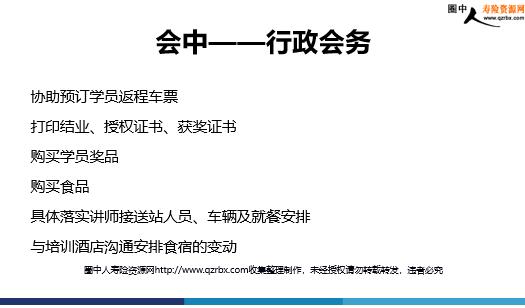 保险培训班的 会前会中会后操作流程 思考 是否有过办班经历?办班的最大感受是什么?像类似本次培训班,你会怎么操作? 需求调研 以本次培训班为例 确定培训对象、课程设计和开发 确定授课讲师 拟定预算,进行报备审批 发送联系函、邀请函 讲师课程准备 参训名单汇总 培训时间、培训周期、培训地点 会务资料准备、会场布置等食宿安排、接站、报到、 预备会、开训 教学实施、通关、演练或测试 结训 培训总结、评估与反馈 费用核销 整理归档 班主任一名助教或其他工作人员若干名(可从学员中选班委)授课讲师 人力配置 培训班操作流程 需求调研培训规划(根据培训需求拟定培训对象、人数、时长、时间、地点、课程等)培训地点的确认:本地或外地,并按费用标准谈妥各项费用拟定预算,进行报备审批培训通知的拟写、下发培训班行事历拟定,工作细化落实到人(班主任、助教、会务人员确认) 会前——前期流程 培训回执的统计及学员的选拔、确认培训日程安排(课表排定)讲师确认、邀请及备课根据名单分组、房间分配、建立微信群、与助教沟通、安排