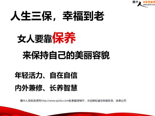 保险说明会之养老是女人最大的问题 2026女人月机会多多 可以举办系列主题活动女性健康沙龙优雅女人系列(我爱彩妆、我爱厨房、我爱DIY……)、亲子教育讲座……… 女人的四季 节日快乐 男人眼中的 成功的女性:事业和家庭能够内外兼顾的女性,还应懂得经营自己,享受幸福! 成功女性 她学会如何打高尔夫,如何评鉴美酒;她学会了温柔聆听?;? 她学会了表达自己的意见;她学会了摄影、舞蹈;? 她学会让自己高贵美丽;她学会经营自己的事业! 做一个优雅独立的女人? 50岁以上的女人中有47%的人是单身:(她们必须在经济上支撑自己) 50%的婚姻以离婚收场;(离婚后孩子一般由谁抚养?是女人!)(婚姻中夫妻第一要争的是什么?钱!)离婚后第一年,女性的生活水平平均下降73%。老年贫困人口中:?为女性 80%的女人在丈夫在世时并不贫穷。 90%的女人在一生中必须独自承担自己的经济压力…… 但79%的女人并没有为此做好准备。 女人和金钱的数据背后…… ——(美)茱蒂瑞斯尼克《女人要有钱》 女人必须面对的问题—— 1.身体健康;(特别是女性特有疾病) 2.心灵自由;(经济上的和精神上的) 3.经济独立;(有足够的养老金) 4.子女教育;(接受良好的高等教育) 都说不爱自己的女人如何能让别人爱自己呢?有多少女性在忙忙碌碌地生活中给自己留一些关爱的时间? 女人为什么需要理财? 智慧女人会理财 “我现在还年轻,还用不着理财”! 女性通常都是到了不得不做的地步才去面对理财的问题。 一般而言,女性的平均薪水较男性低。即使有退休金可领,因为职位多低于男同事,她们可领取的金额也会比男性来得少。因此,女性必须将理财的工作成为生活的一部分,积极追求财富的增长,才能让自己享受优质的生活水准。