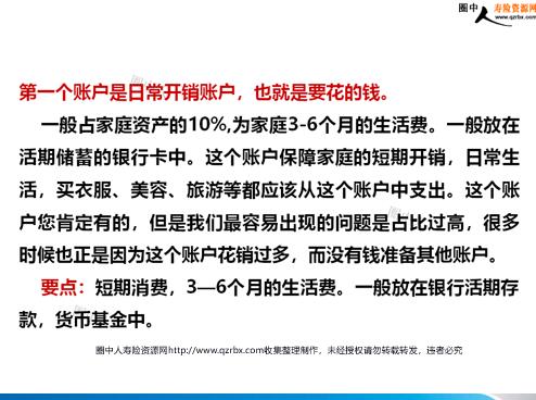 最合理稳健的家庭资产分配方式 标准普尔(standard&Poors)为全球最具影响力的信用评级机构,专门提供有关信用评级、风险评估管理、指数编制、投资分析研究、资料处理和价值评估等重要资讯。成立一百四十多年以来,标准普尔一直扮演着市场领导者的专业角色,其所提供的各项参考指标,更是广大投资者进行重要投资和财务决策时的专业凭据和信心保证。标准普尔曾调研全球十万个资产稳健增长的家庭,分析总结出他们的家庭理财方式,从而得到标准普尔家庭资产象限图。此图被公认为最合理稳健的家庭资产分配方式。标准普尔家庭资产象限图把家庭资产分成四个账户,这四个账户作用不同,所以资金的投资渠道也各不相同。只有拥有这四个账户,并且按照固定合理的比例进行分配才能保证家庭资产长期、持续、稳健的增长。 第一个账户是日常开销账户,也就是要花的钱。一般占家庭资产的10%,为家庭3-6个月的生活费。一般放在活期储蓄的银行卡中。这个账户保障家庭的短期开销,日常生活,买衣服、美容、旅游等都应该从这个账户中支出。这个账户您肯定有的,但是我们最容易出现的问题是占比过高,很多时候也正是因为这个账户花销过多,而没有钱准备其他账户。要点:短期消费,3—6个月的生活费。一般放在银行活期存款,货币基金中。 第二个账户是杠杆账户,也就是保命的钱。一般占家庭资产的20%,为的是以小博大。专门解决突发的大额开支。这个账户保障突发的大额开销,一定要专款专用,保障在家庭成员出现意外事故、重大疾病时,有足够的钱来保命。这个账户主要是意外伤害和重疾保险,因为只有保险才能以小搏大,200元换10万,平时不占用太多钱,用时又有大笔的钱。这个账户平时看不到什么作用,但是到了关键的时刻,只有它才能保障您不会为了急用钱卖车卖房,股票低价套现,到处借钱。如果没有这个账户,您的家庭资产就随时面临风险,所以叫保命的钱。您有这个账户吗?要点:意外重疾保障专款专用,解决家庭突发的大开支 第三个账户是投资收益账户,也就是生钱的钱。一般占家庭资产的30%,为家庭创造收益。用有风险的投资创造高回报。这个账户为家庭创造高收益,往往是通过您的智慧,用您最擅长的方式为家庭赚钱,包括您的投资的股票、基金、房产、企业等。这个账户您肯定有的,相信以您的智慧收益也很高。这个账户关键在于合理的占比,也就是要赚得起也要亏得起,无论盈亏对家庭不能有致命性的打击,这样您才能从容的抉择。要点:重在收益,这个账户最大的问题是偏向性,很多家庭买股票第一年占比30%,股票、基金、房产等。投资≠理财,看得见收益就看得见风险结果赚了很多钱,第二年就用90%的钱去买股票了。结果可想而知... 第四个账户是长期收益账户,也就是保本升值的钱。一般占家庭资产的40%,为保障家庭成员的养老金、子女教育金、留给子女的钱等。一定要用,并需要提前准备的钱。这个账户为保本升值的钱,一定要保证本金不能有任何损失,并要抵御通货膨胀的侵蚀,所以收益不一定高,但却是长期稳定的。