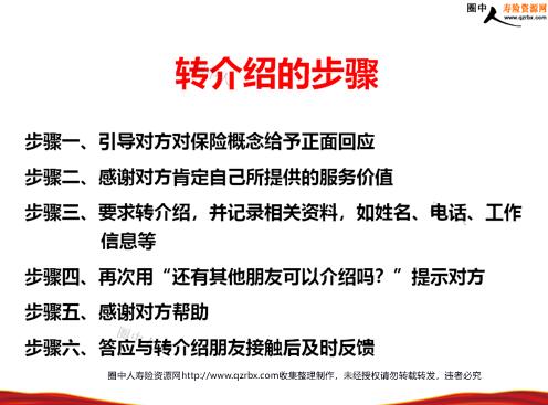 保险培训之转介绍的定义好处及其步骤 转介绍的定义 通过客户、准客户的介绍获得名单、资料,通过对这些名单的编辑、整理和筛选,把其中的一些作为拜访名单。转介绍的意义 如果有一个三十天的工作给你选择,工钱有两种计算方式,你会选择哪一种呢?第一种方式:一个月给10万块第二种方式:第一天给你1块,第二天给2块,第三天给4块,以后每天都给你前一天工钱的两倍如果你现在只有两个客户,但是每个客户能给你再介绍两个新客户,然后被介绍的客户继续给你介绍两个新客户……你将拥有取之不尽的客户资源! 转介绍的重要性 美国西北互助人寿公司曾做过一项调查与研究,在5460位持怀疑态度的准保户中,有2240位是经由陌生拜访而成为准保户的;其余3400位,全是经由转介绍成为准保户的。在由陌生拜访而来的准保户中,完成了56件销售促成率是11%;在由转介绍而来的准保户中,完成了456件销售促成率是40%。这项研究显示,经由转介绍而促成的比率高出陌生拜访的四倍。 客户愿意转介绍的真正原因 为什么某些客户不愿意提供转介绍? 客户担心会引起朋友和亲戚的困扰客户认为财务方面的事情属于个人隐私客户不希望被朋友认为他喜欢在背后说长道短客户通常倾向以朋友的收入当作是否为恰当转介客源的标准一般而言客户不太重视业务员的要求客户也许相信产品品质,却不相信业务员的品质客户担心业务员搞不好会很快离职客户不觉得他帮助业务员,对自己有什么好处客户可能想不起来有谁可以转介绍给我们 转介绍的好处 三“高”:客户质量高认同度高成功率高一“低”:成本低二“易”:易获得批量优质名单易获得同质性的客户 每个客户身边大约有250个亲朋好友,其中与客户同质人员(收入相当、年龄相近、家庭结构相似)约占20%,即50人。 转介绍规则:250定律 ——乔.吉拉德 客户转介绍的要点 自信向客户提供优质服务,以获取客户的信任和支持争取主动,开口向客户提出要求要用引导性问题争取名单打消客户可能的顾虑,降低客户的压力不论成败皆向介绍人回馈拜访经过不忘表示感谢不可过分利用及伤害介绍人的关系