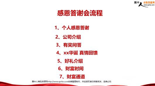 保险个人感恩答谢会 活动流程 尊敬的来宾: 会议即将开始 请将通讯工具关闭 或调至静音档 感恩答谢会流程 1、个人感恩答谢 2、公司介绍 3、有奖问答 4、xx华诞真情回馈 5、好礼介绍 6、财富时间 7、财富通道 感恩答谢 公司介绍 有奖问答 xx华诞真情回馈 活动宗旨 真情回馈 专属时间 专属客户 专属回馈 不惜一切代价,不计利益得失 限时限量特惠险种,抢到就是赚到! 因为尊贵所以限量 因为有限 所以只向到场客户开放 定向回馈 限人 限额 限时 限场 名额有限先抢先得 本场限定 XX个名额 男人买的是责任 女人买的是品质 老人买的是尊严 小孩买的是未来 平民买的是底线 中产买的是平稳 有钱买的是传承 开户有大奖 会员有惊喜 现场开户1.2万元 第X套五连号人民币 纪念册一套 现场开户2万元 第X套八连号人民币 纪念册一套 现场开户3万元 第X套人民币纪念册一套 现场开户5万元 第X套人民币纪念册合订本一套 名额有限先抢先得 本场限定 XX个名额