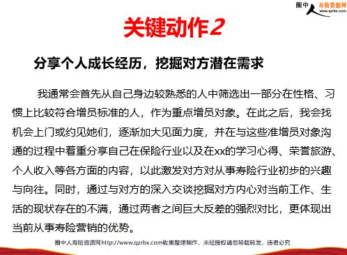 保险增员的关键动作与观念转变 在晋升道路上的一帆风顺,主要取决于增员过程中始终坚持的五个关键动作。 关键动作1 与身边的亲朋好友经常讲“三讲” 曾经有过同业经历的我,被xx的“三高”文化所吸引而加盟xx。加入xx之后,更切身感受到xx的与众不同。尤其是在增员工作中所体现出来的激情而不失理智、稳健而不冒进的做法,更让我深刻感受到xx的专业绝非浪得虚言。对xx的高度认同,让我有更加充足的底气面对众多亲朋好友。每逢亲朋聚会,我都会抓住一切可能的机会、利用一切可能的时间为亲友做现场版的“三讲”。通过自己最真实的感受、最具煽动性的语言,来为他们描绘出一副我所从事的保险行业以及xx将来的美丽蓝图。 关键动作2 分享个人成长经历,挖掘对方潜在需求 我通常会首先从自己身边较熟悉的人中筛选出一部分在性格、习惯上比较符合增员标准的人,作为重点增员对象。在此之后,我会找机会上门或约见她们,逐渐加大见面力度,并在与这些准增员对象沟通的过程中着重分享自己在保险行业以及在xx的学习心得、荣誉旅游、个人收入等各方面的内容,以此激发对方对从事寿险行业初步的兴趣与向往。同时,通过与对方的深入交谈挖掘对方内心对当前工作、生活的现状存在的不满,通过两者之间巨大反差的强烈对比,更体现出当前从事寿险营销的优势。 关键动作3 陪同新人现场观摩学习,有效助推新人加盟意愿 当准增员对象已经开始在思想上产生了一些动摇,并初步对寿险行业产生了越来越多的兴趣点。此时,为趁热打铁,尽可能在短时间内,劝说并陪同对方到公司职场进行实地参观考察,并在参观过程中借助公司各种荣誉墙等实物,再一次对准增员对象进行实地“三讲”。此外,陪同准增员对象一起参加公司外勤大早会,现场近距离感受寿险公司外勤团队与众不同的氛围,从内心深处再一次撬动准增员对象的加盟愿望。 关键动作4 帮助组员成长的同时,也是帮助自己成长 真正意义上的增员,并不是简单把人增进来,交了押金,就算成功。作为主管,还必须时刻关注组员心态、状态,并帮助组员尽快稳定心态,并通过勤劳拜访、展业实现定着,直至成长。组员的成长一般包括很多方面,比如语言表达能力、逻辑学习能力、人际交往能力甚至管理能力等等。组员的成长其实与主管自身息息相关,无论是主管责任还是主管利益,主管在帮助组员成长的同时,势必要先让自己率先更快地成长,正所谓“成人达己”,大家一起学习、一起成长,才能够真正感受到主管的力量、团队的力量。而这种正能量的传递也必将在整个团队中产生积极向上的促进作用。