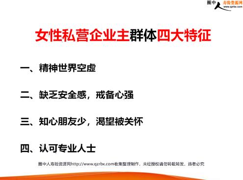 女性私营企业主群体的特征及走进动作 女性私营企业主群体四大特征一、精神世界空虚二、缺乏安全感,戒备心强三、知心朋友少,渴望被关怀四、认可专业人士 一、精神世界空虚 由于工作忙碌,身不由己,自己真正感兴趣、想做的事情,都没办法去做没有办法做到我行我素,在人群中强行伪装自己,在员工面前无法流露真情二、缺乏安全感、戒备心强 生意好了,遭人妒忌生意不好,怕人笑话总是担心不知道谁什么时候就捅我一刀时刻处于高警惕状态,好累三、知心朋友少,渴望被关怀 围绕在身边的人不少,每日门庭若市无可倾诉,不知道可以跟谁讲心里话接触的朋友都是有事相求又假装关心 四、认可专业人士 成功吸引成功客户更认可专业,也更容易接受专业人士的建议五个动作走近女性私营企业主一、适度自我展现二、寻找共同话题三、专业领域自信交流四、做一位耐心的倾听者五、把握关键时点体现关爱一、适度自我展现 谦逊但又不失自信的第一次见面女性天生三分攀比心,更容易产生嫉妒及排斥心理若过度炫耀,会使客户在见面之初就从内心产生抵触心理,不利于进一步沟通与再次约见 适度打扮非常重要得体的职业装生活淡妆首饰不能太过奢华、不超过三件 适度打扮,增加客户认可度和信任感 着装不得体,很容易引起客户反感我曾与组员拜访一位转介绍高端客户,由于天冷,着装没太注意,两人都穿着皮草,见面时客户现场表现很冷淡事后从转介绍人那里得知,这位高端客户原本是主动想要了解保险,但因我们的着装而心生厌烦